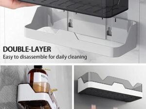 OUPSTRIVE Bathroom Organizer Set – Self Adhesive Bathroom Shelf & Soap Dish Holder (2 Wall Shelves + 2 Soap Holders + 6 Adhesive Hooks) | No Drilling, Wall Mounted Washroom Rack Stand