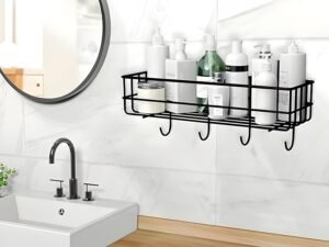 Pack -2, Wall Mounted Bathroom Shelf Organiser with Hooks, Black,Storage Rack for Home & Kitchen use