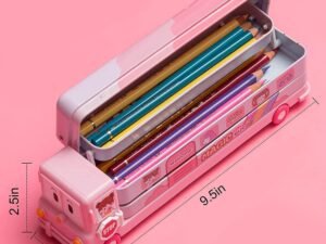 PRIME DEALS Bus Shape Pencil Box School Bus Metal Geometry Box for Kids Magic Bus with Moving Tyres with 3 Compartments Moving Tyre’s & Sharpener Geometry Case for Boys & Girls (Pink)