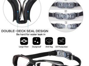 PRIME DEALS Mirrored Wide-Vision Swim Goggles Pro Clear Lens & Swimming Goggles with UV and Anti Fog Protection for Adult Men Women with Free Protective Case, Nose Clip, Ear Plugs (Aqua Black)