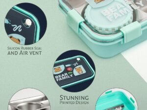 PRIME DEALS Lunch Box Sealed Leakage Proof Stainless Steel Lunch Box with Fork Chopstick&Spoon Lid Office Food Container for School Kids and Adults 750ml (Light Green, Bear Kawaii 3 Compartment)