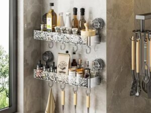 Ameedarshan Suction Cup Wall Mounted Storage Rack, Bathroom Shower Acrylic Towel Shelf, Glacier Water Ripple Road Transparent Wall Rack with 4 Hooks, Suitable for Bathroom Kitchen