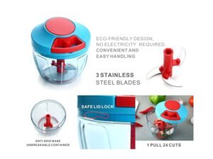 Vegetable & Dry Fruit Handy Chopper 450ml – Mini Manual Cutter with 3 Steel Blades for Onion, Garlic, Fruits, Whisking & Multipurpose Kitchen Use (Sky Blue & Red)