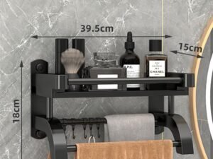 wolpin Stainless Steel Wall Shelves with Towel Hanger & Hooks Multipurpose Wall Mount Bathroom Storage Rack Box Strong Bathroom Accessories Rack Shelf, Set of 1, Black