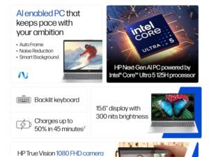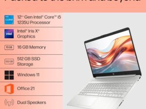 HP 15, 12th Gen Intel Core i5-1235U Laptop (16GB DDR4, 512GB SSD) Anti-Glare, 15.6″/39.6cm, FHD, Win 11, Office 21, Silver, 1.69kg, Intel Iris Xe Graphics, HD Camera, Backlit Keyboard, fy5009tu