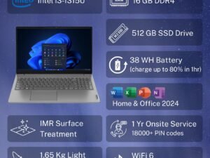 Lenovo V15 Intel Core i3 13th Gen (16GB RAM/512GB SSD/Windows 11 Home/Office 2024/Iron Grey) 15.6″ FHD (1920×1080) Antiglare 250 Nits Thin & Light Laptop/1Y Onsite/1.65 kg, 83CCA08KIN