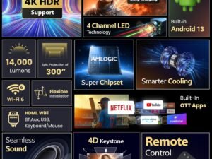 Crossbeats Lumex Pro Smart Projector 4k Ultra HD, Mini Projector for Room Native 1080P, Upto 14000 Lumens Android 13 Built-in Apps Netflix, Prime, Portable Design, Speaker WiFi 300″ Wide Display Black