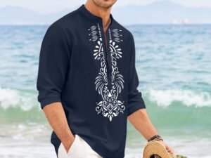 FINIVO FASHION Men’s Cotton Blend Short Kurta with Bold Printed Front Design | Full Sleeve Ethnic Casual Kurta with Mandarin Collar | Artistic Festival & Travel Wear for Modern Ethnic Style