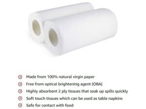 Amazon Brand – Solimo 2 Ply Kitchen Tissue/Towel Paper Roll 240 pulls | 60 pulls X 4 Rolls | soft and highly absorbent | 100% Natural Virgin Cellulose Fiber