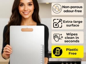 OrganizeMee Large Stainless Steel Cutting Board for Kitchen – Premium Vegetable and Fruit Cutter, Heavy-Duty Metal Chopping Board, Big Size Pad (36 cm X 25 cm)