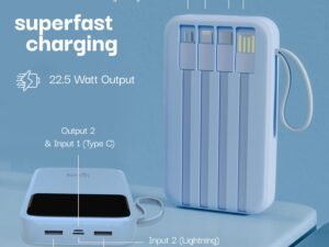 Lifelong Electronics 20000mAh 22.5W Fast Charging QC 3.0 Power Bank | 3 Inputs (in-Built Cable + Lightning + Type-C Port) | 6 Outputs (3 in-Built Cable + USB + Type-C Port) Blue