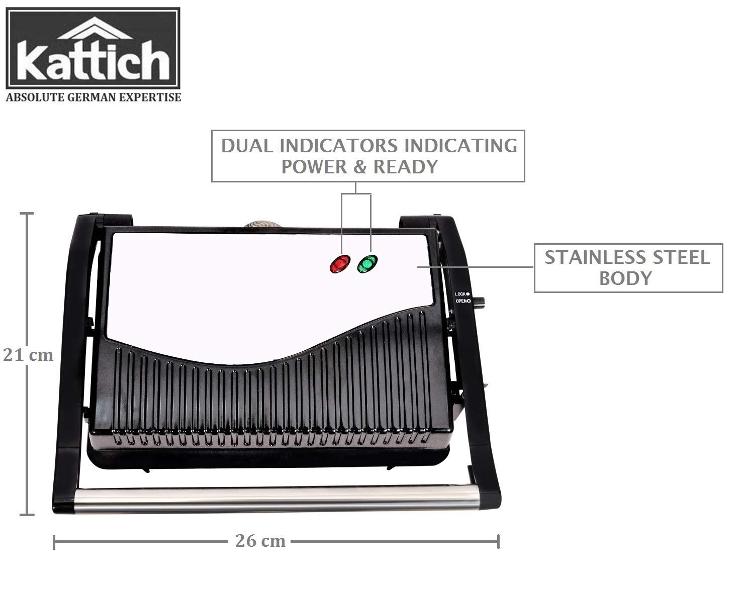 KATTICH Stainless Steel Electric OPEN MINI GRILL and Sandwich Maker makes grilling virtually dependable! The 2-slice 230*145 mm non-stick coated plates quickly and evenly heat up your food with 750-watts of power so there’s no need to flip it, or even watch over it. It comes equipped with Auto Shut-Off technology which turns the grill off when your food is ready. It also has 2 illuminated indicator lights; red tells you that it’s preheating and green tells you it’s ready to cook.
