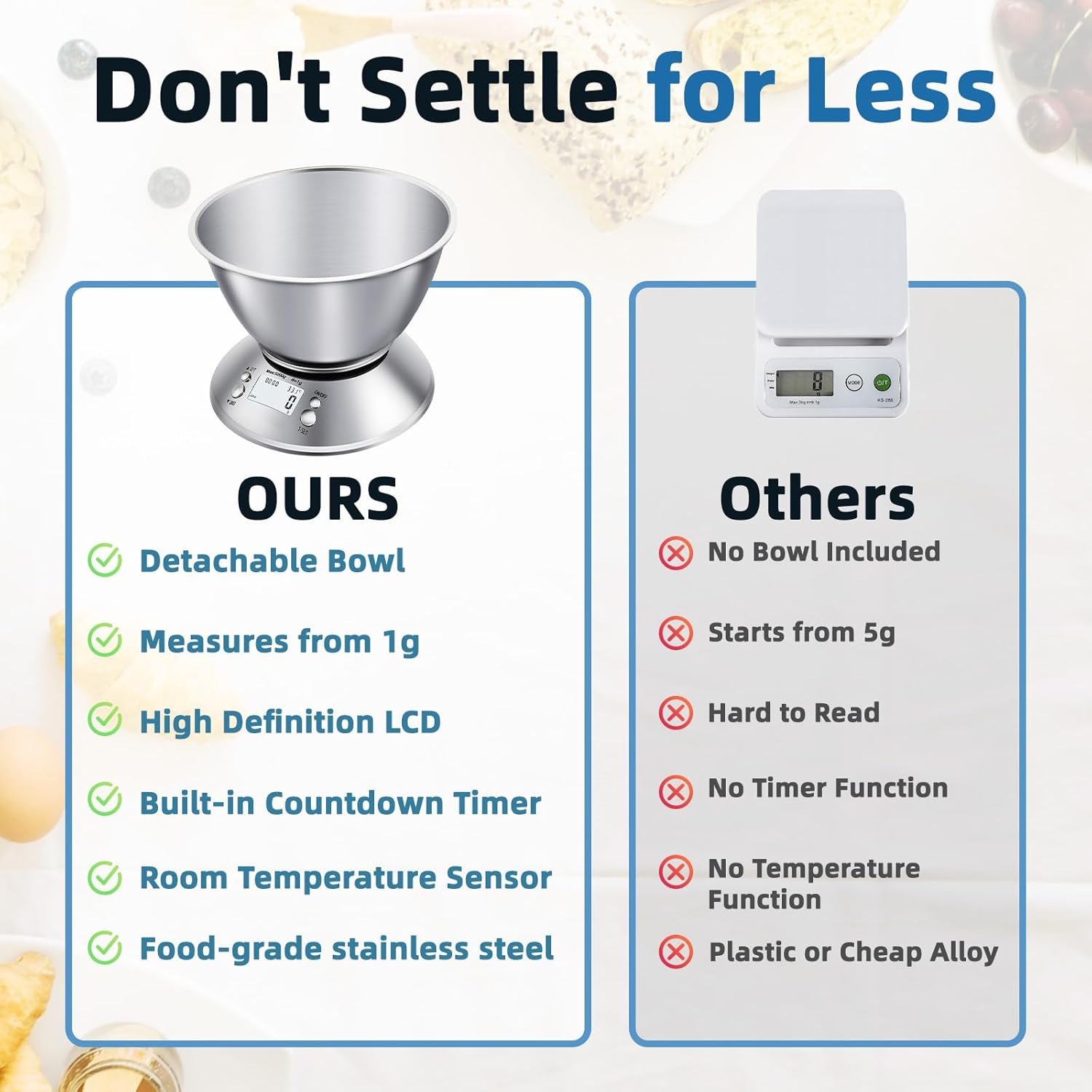 1g Precision for Better Cooking: Accurate to 1g, this scale handles up to 5kg. Ideal for measuring ingredients for baking, cooking, portion control, and more