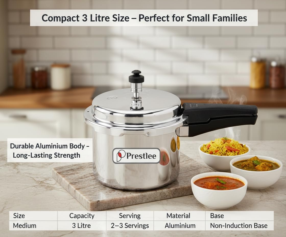 Durable Aluminium Build: Crafted from high-quality aluminium, this 3-litre pressure cooker ensures long-lasting performance and even heat distribution for faster cooking, making it a reliable addition to your kitchen.