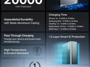 “This power bank is compact and powerful, offering fast charging and a long battery life. I love the capacity of this power bank – it’s really useful on long train journeys. A great feature is the dual mode where I can charge the power bank and, from another port, charge my phone. So with one power socket, I can charge both my device and the power bank. The power bank is super durable, it’s design made with hard plastic. It comes with support for both micro-USB and Type-C cables. It supports fast charging and can easily charge my phone 3 times or more. It charges quickly, so no issue.”