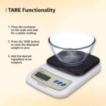 TARE Functionality: Easily calculate the net weight of ingredients by subtracting empty bowl or the container weight. Touch the TARE button to reset the scale back to zero and weigh ingredients by adding it in to the same container.