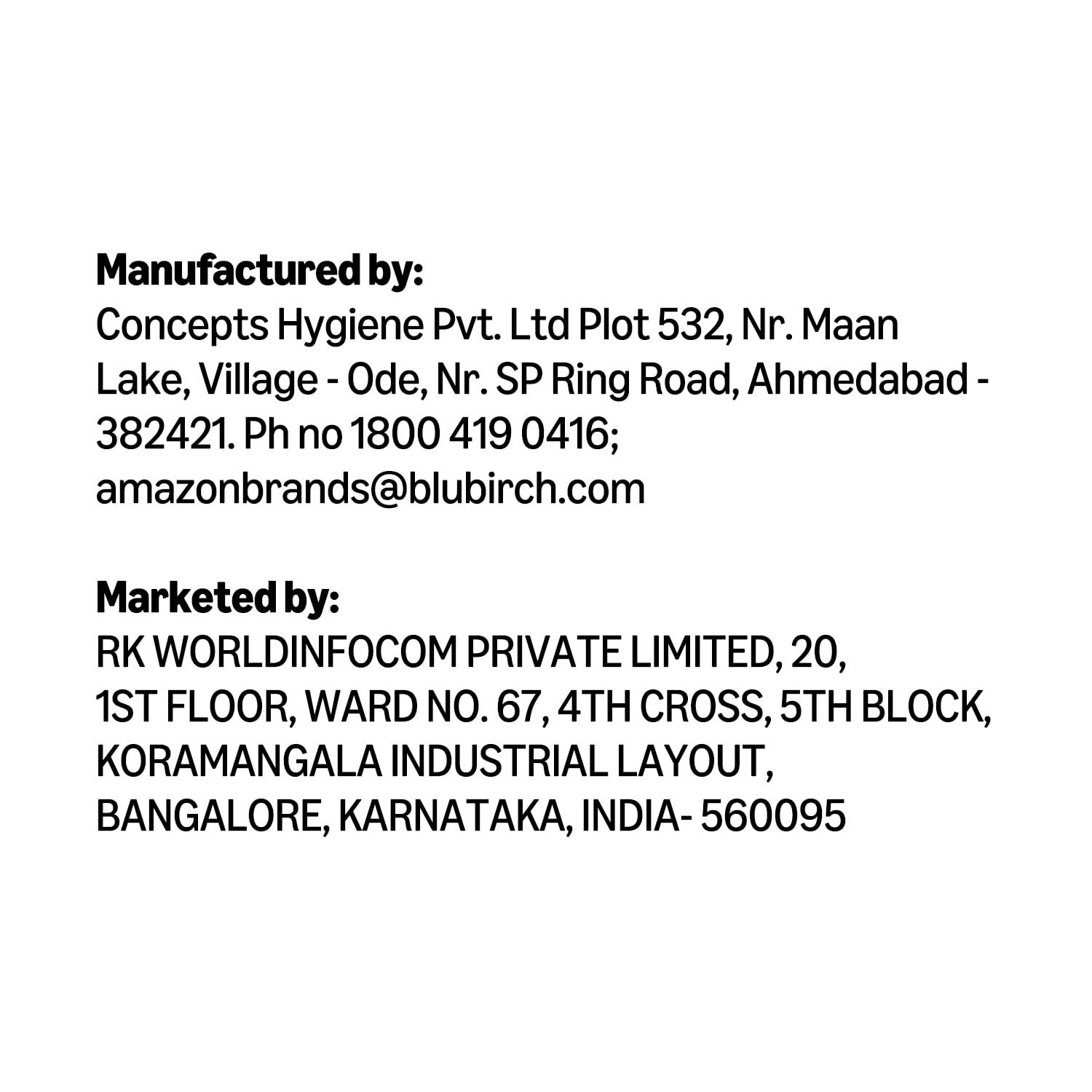 Manufacturer : Concepts Hygiene Pvt. Ltd, Concepts Hygiene Pvt. Ltd, Plot 532, Nr. Maan Lake, Village – Ode, Nr. SP Ring Road, Ahmedabad – 382421. Ph no 1800 419 0416; amazonbrands@blubirch.com