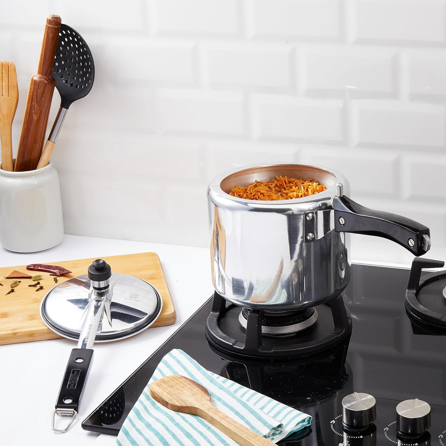 Superior wall and base thickness: Wall thickness – 1.73 mm, base thickness – 3.60 mm; Optimised weight – 1.4 kg; Material: Aluminium; Package contents: 1 pressure cooker (3 litres)