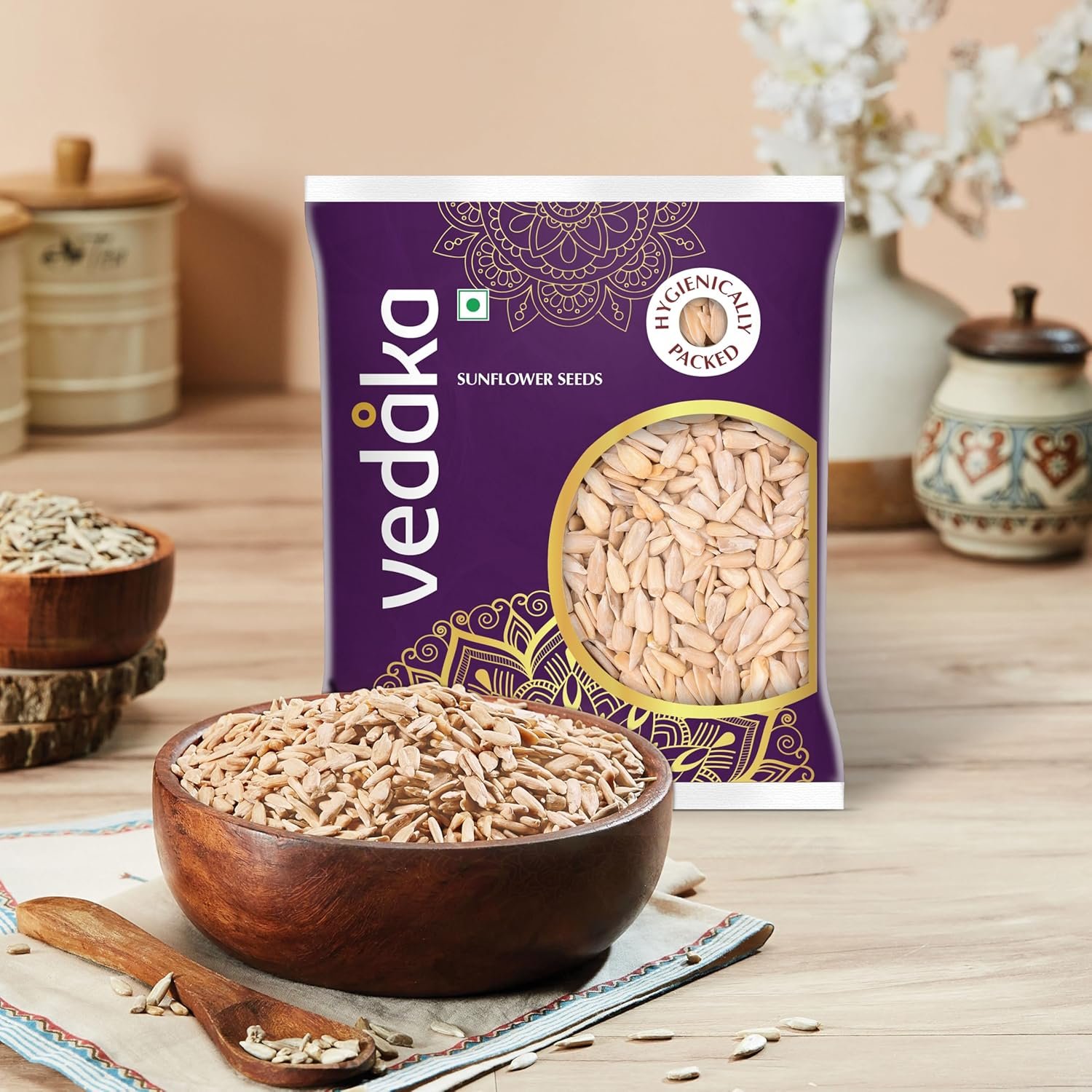 Introducing Vedaka Raw Sunflower Seeds. This product offers the fresh and natural taste of sunflower seeds for a satisfying snack. Packed in a hygienic polybag at a facility that meets food safety standards, these seeds ensure cleanliness and quality. Rich in magnesium and other minerals, they make for a great snacking option. Ideal for on-the-go snacking, baking, or adding a crunchy texture to meals, these versatile seeds come in a 500g pack.