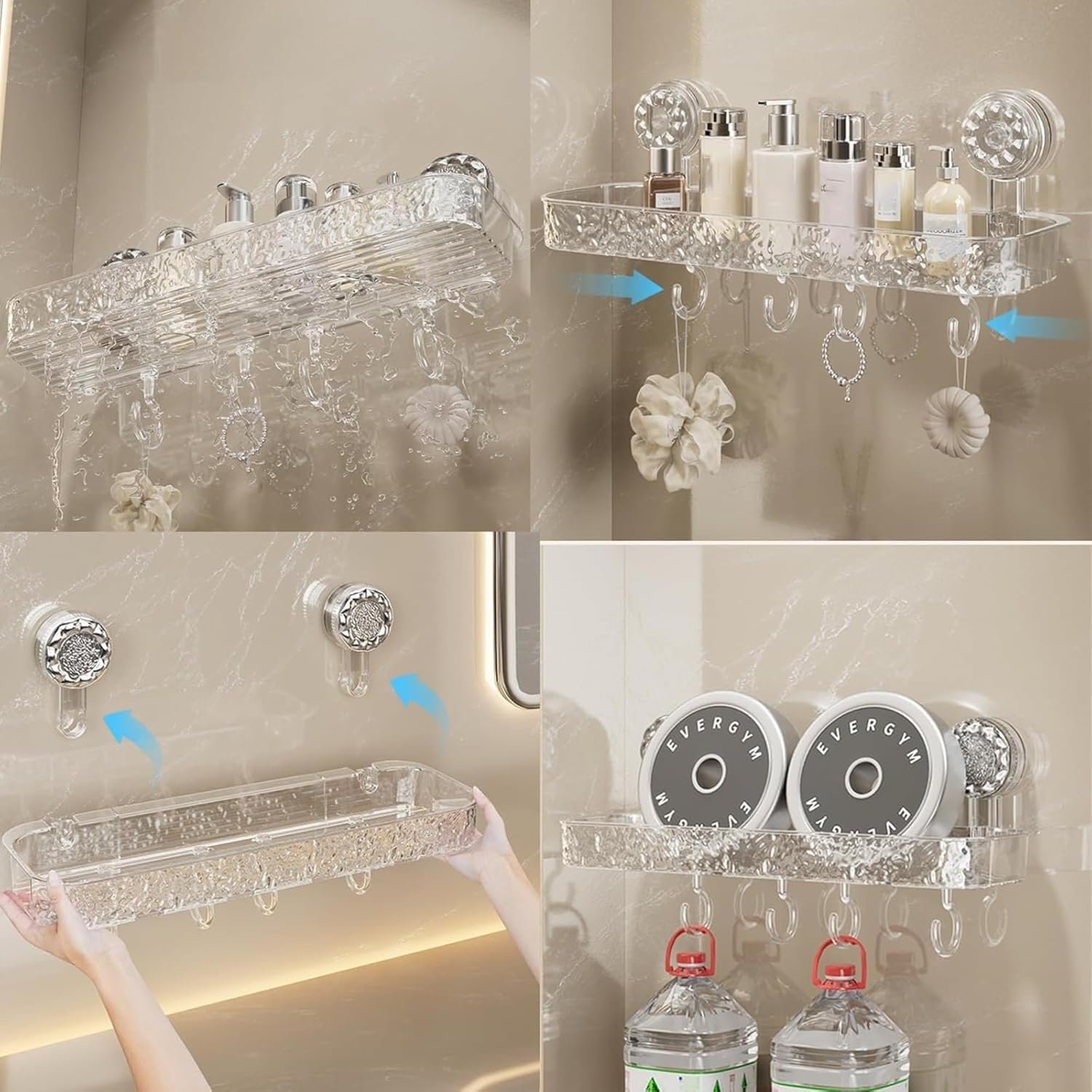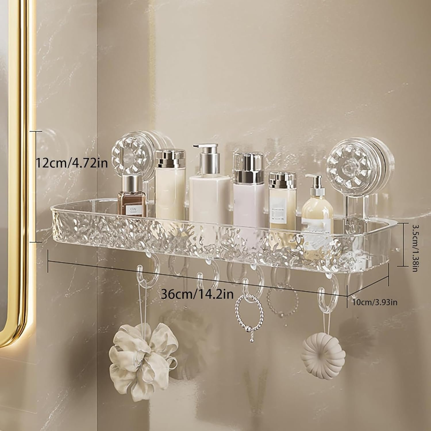 Ameedarshan Suction Cup Wall Mounted Storage Rack, Bathroom Shower Acrylic Towel Shelf, Glacier Water Ripple Road Transparent Wall Rack with 4 Hooks, Suitable for Bathroom Kitchen