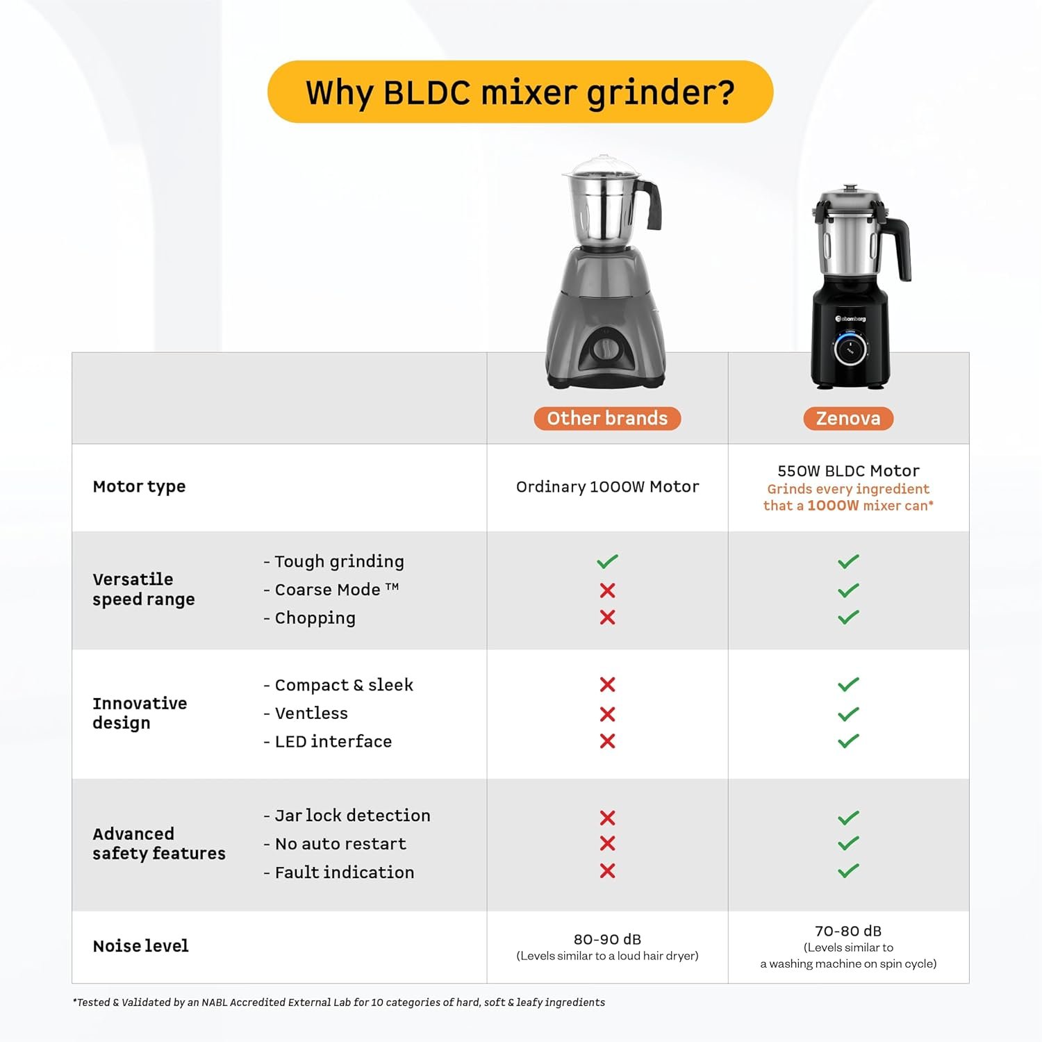 Powered by an Intelligent BLDC Motor Atomberg Zenova Mixer Grinder grinds every ingredient that a 1000W Mixer can like turmeric, garam masala, and coffee beans
