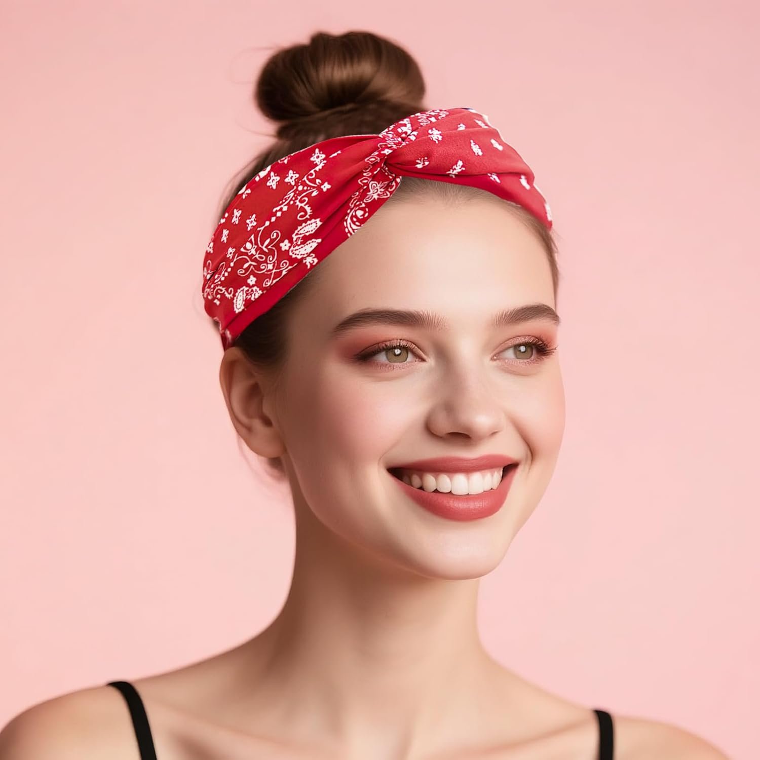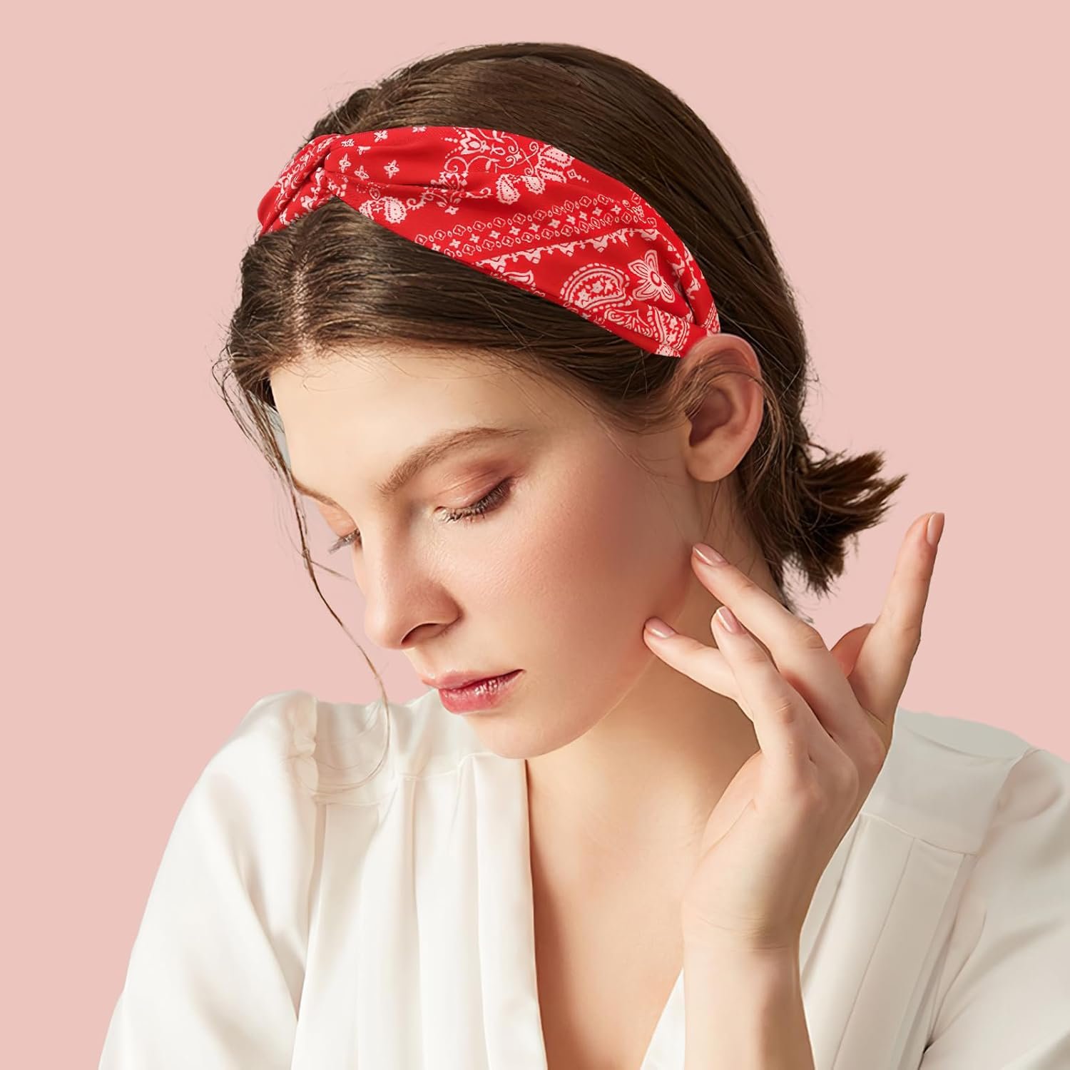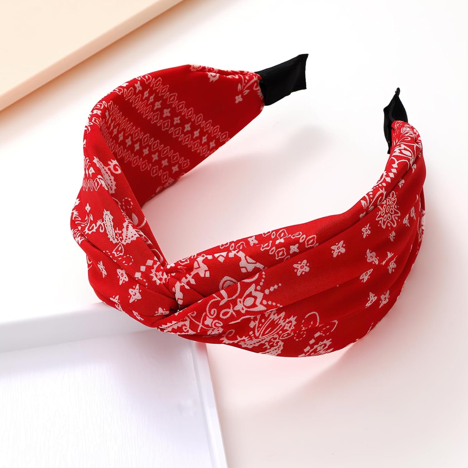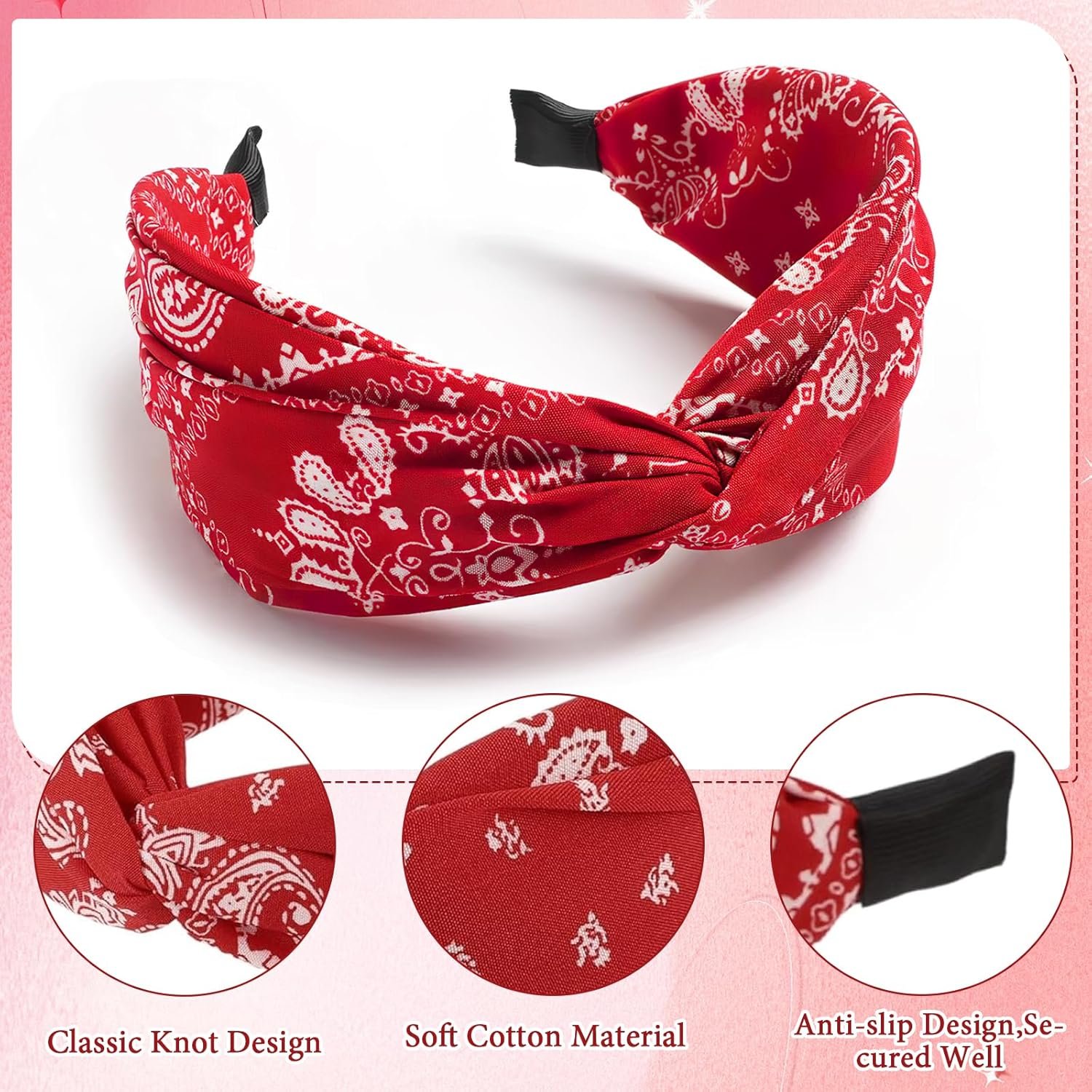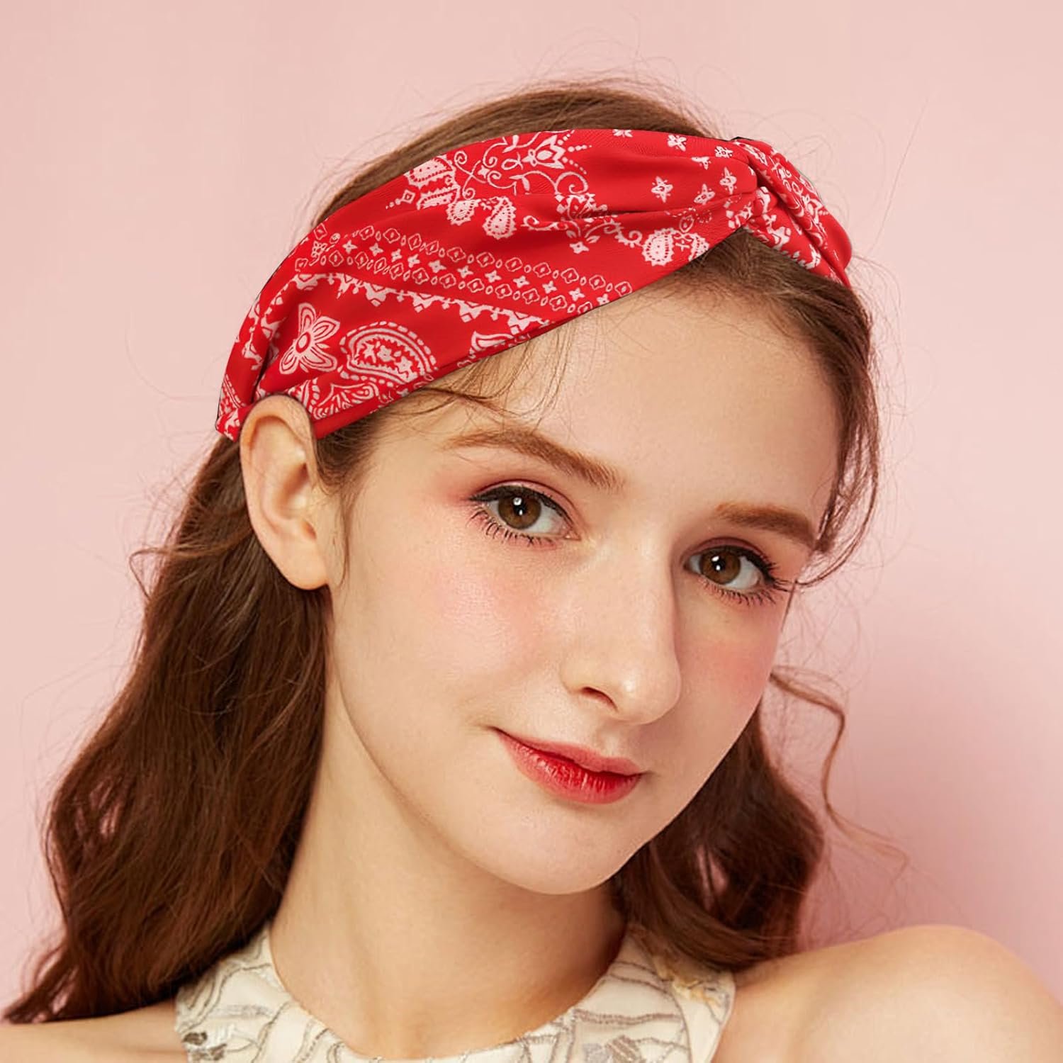 Bandana Headbands for Women | Red Hair Band for Girls with Cross Twist Knot | Wide Non-Slip Boho Paisley Headband for Fashion, Workout, and Travel