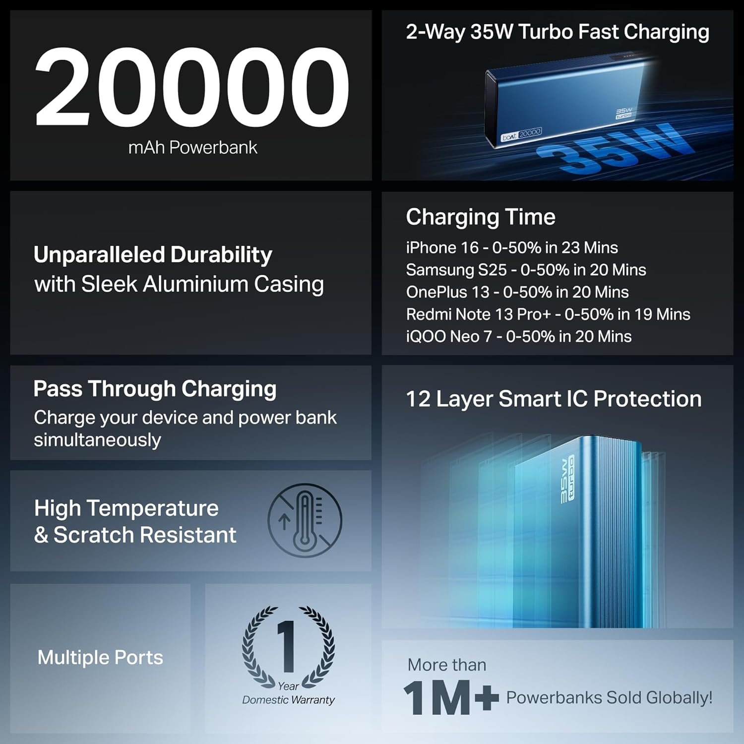 This boAt PB435 Turbo is a beast when it comes to charging. The 35W super-fast charging really makes a difference — it powers up my phone and even my tablet quickly. The 20000mAh battery easily lasts for two full charges, and the aluminum body feels premium and sturdy in hand. I love that it has triple output and dual input, making it super convenient for multiple devices. Overall, a stylish, powerful, and reliable power bank worth every rupee!