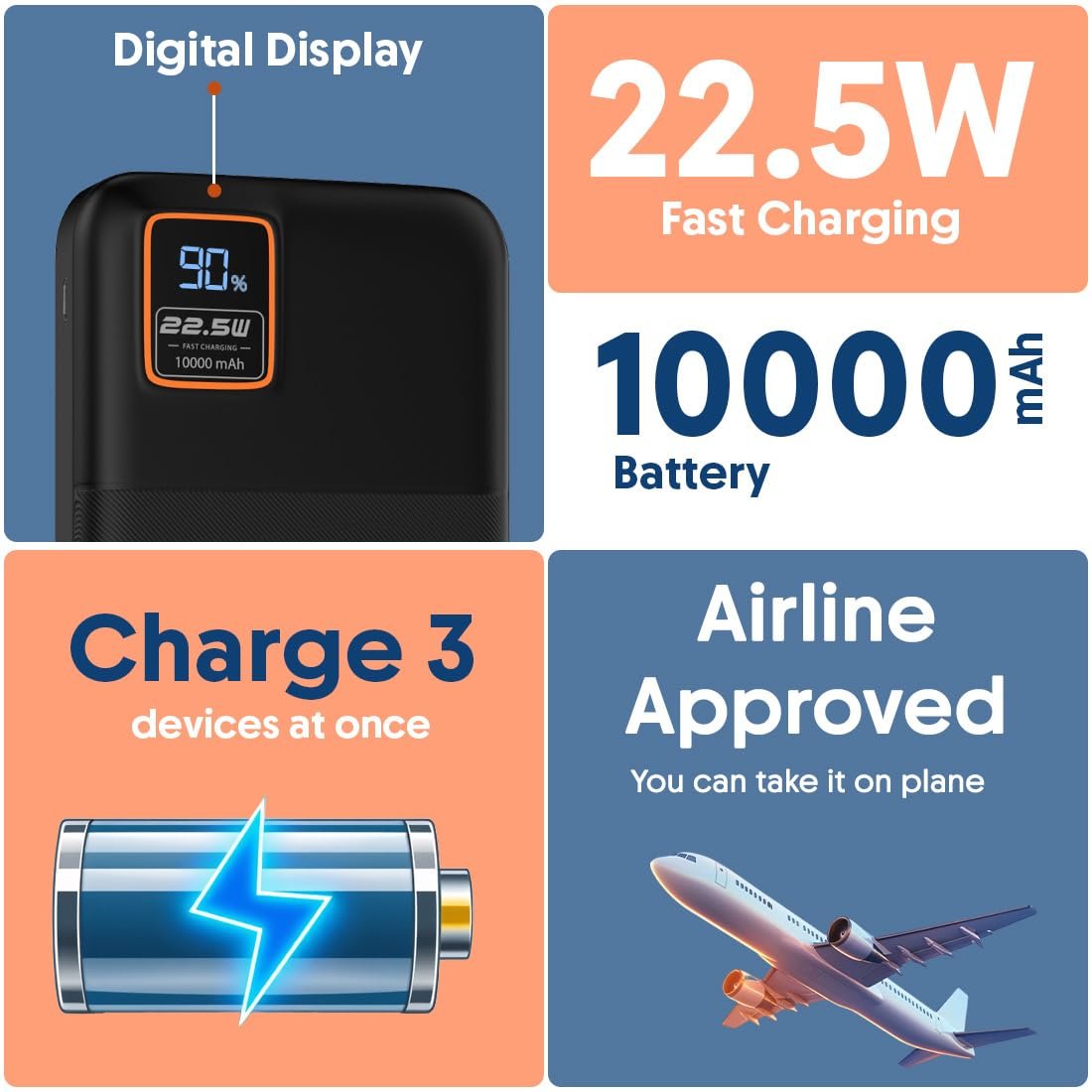 Fast Charging Support: Delivers up to 22.5W output with QC charging, providing rapid and efficient charging for compatible devices.