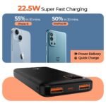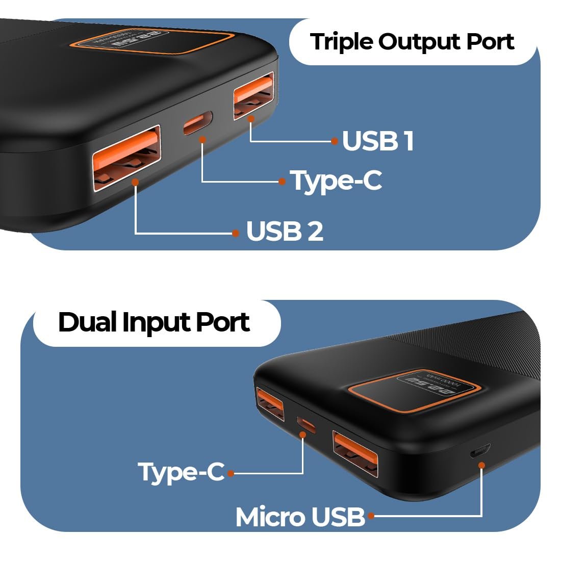 Multiple Inputs & Outputs: Offers dual input ports (Type-C & Micro USB) and triple output ports (Type-C, USB 1 & USB 2), allowing simultaneous charging of multiple devices.