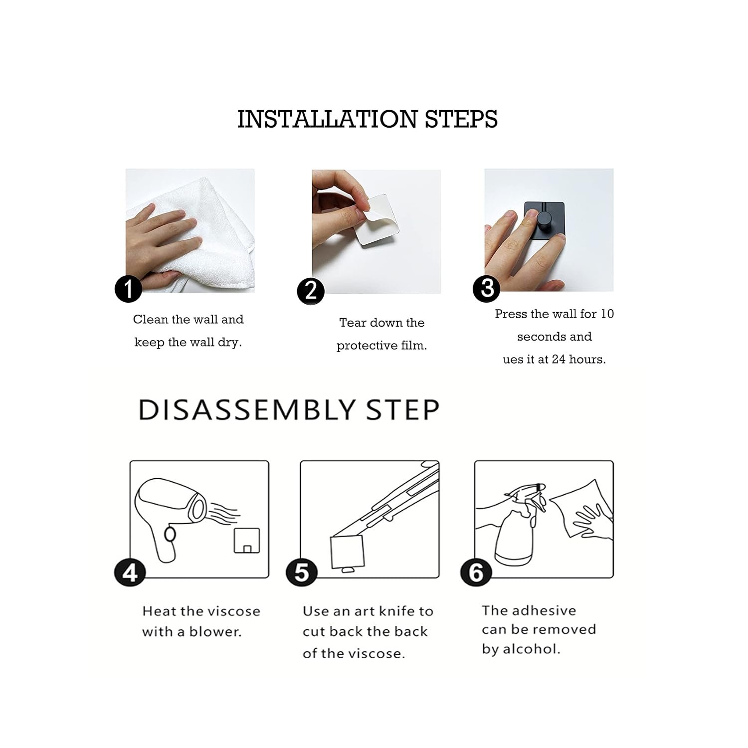 [ Easy Installation and Disassembly]No drilling and tools needed, just peel off the protective film on the back of the hook and stick it on smooth surface. Note:Adhesive hook attached to the wall, waiting 24 hours before use is the best results.When remove it, heat the melted glue with a hair dryer, which can be easily removed. No remains, no damage to the walls.