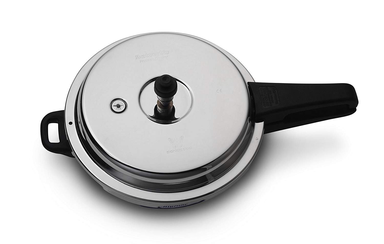 Butterfly Blue Line Stainless Steel Pressure Cooker. Stainless Steel Pressure Cooker with ATB. Body & lid made of premium quality Stainless Steel. Aluminum Thermal Base, Gasket release vent. Comes with Safety Valve and Ergonomically designed handles.