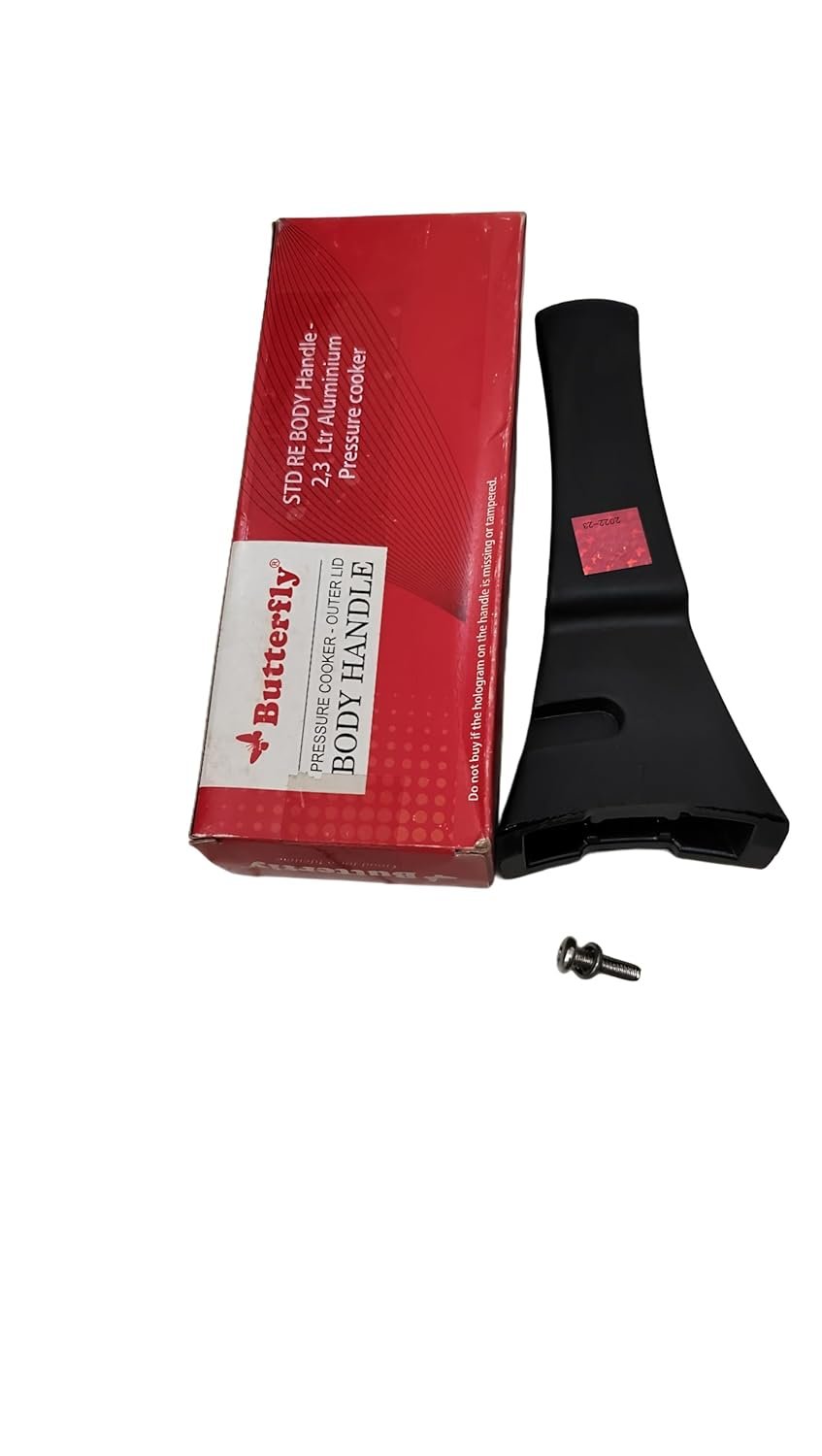 Keep your pressure cooker functioning smoothly with this genuine Butterfly replacement body handle. Specifically designed for 2,3 litre aluminium pressure cookers, this sturdy black handle ensures safe and comfortable operation of your cookware. Made with durable materials to withstand regular use, this spare part helps extend the life of your pressure cooker. The handle comes complete with mounting hardware for straightforward installation. Compatible with STD RE model Butterfly pressure cookers, this replacement handle maintains the original quality and safety standards of your cooking equipment. Regular maintenance of pressure cooker components like handles is essential for safe cooking, and this authentic spare part helps you do just that.