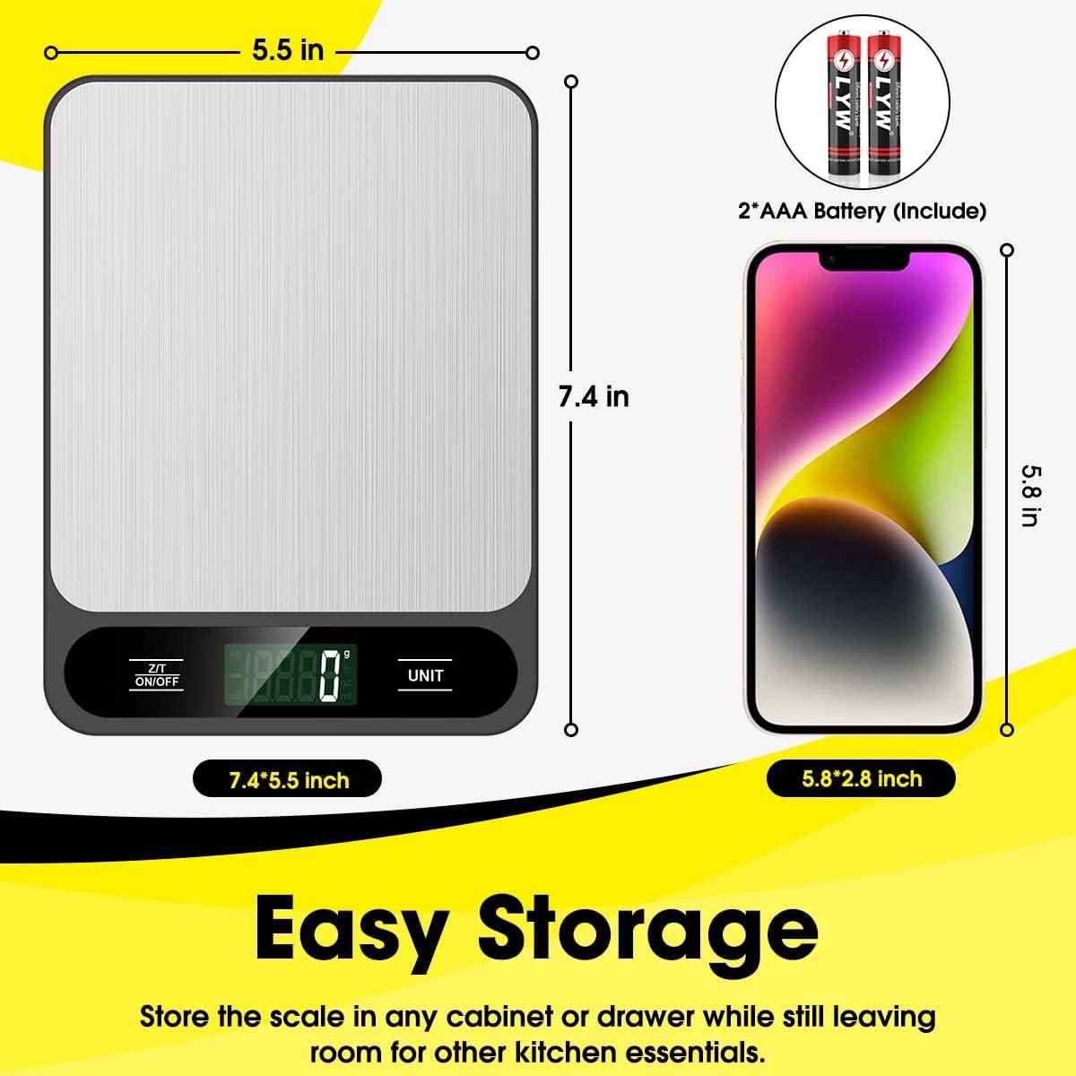 Energy Saving Kitchen Scale-This energy-saving Weigh Scale for Food scales come with 2 AAA batteries (included) to extend the standby time, ensuring long-lasting use. With a simple push-button operation, you can easily turn on the Weight Machine Food and long press for 3 seconds to turn it off, making it convenient and efficient for all your food measuring needs.