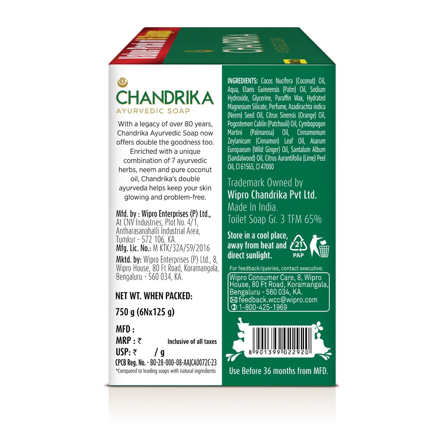 Experience the authentic goodness of Ayurveda with the classic Chandrika Ayurvedic Soap, handmade with natural ingredients that do more than just cleansing for your skin. With its 80 years of wisdom, Chandrika has made this soap bar using ayurvedic herbs soaked in double* the amount of pure Coconut oil. With the goodness of Ayurveda’s best-kept skin secrets, this bathing bar soap helps ensure total skin care. It has an abundance of coconut oil, 2x the amount in leading soaps with natural ingredients. Coconut’s skincare capabilities are endless! It soothes the skin, reducing outbreaks and irritation. Rich in antioxidants and Vitamin E, coconut oil helps slow skin ageing, making your skin soft, supple, and radiant. It also has Patchouli Oil, your skin’s best friend, for its antifungal, antiseptic, and anti-inflammatory properties. Finally, the sweet-scented sandalwood extract helps cool the body, tone the skin, and enliven dehydrated skin with its moisturising properties. The result – Clear, Blemish-free skin, naturally! Try the healthy and happy skin secret today!