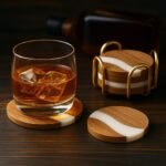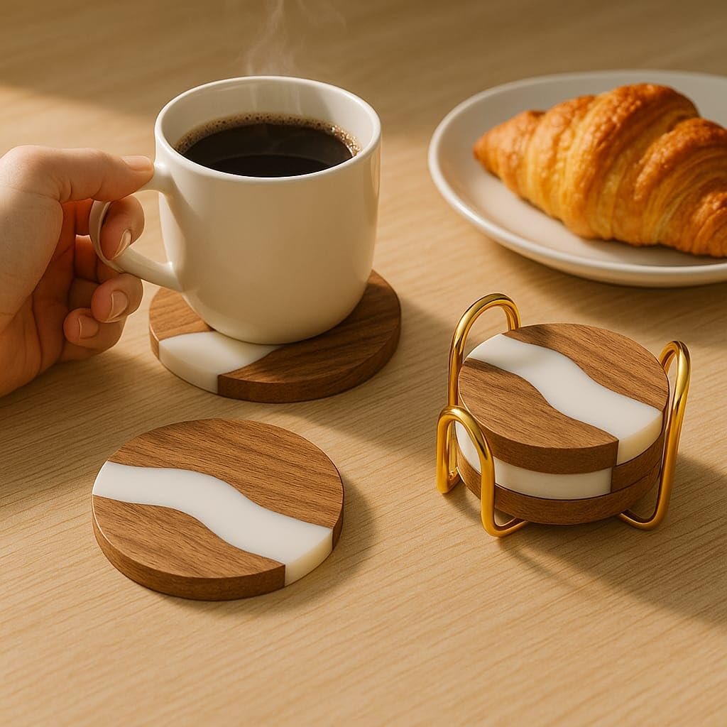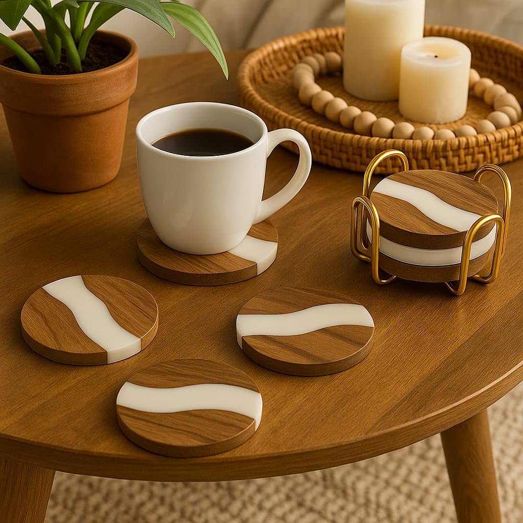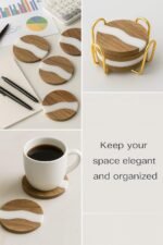 Stylish Resin & Wooden Coaster Set – Modern combination of natural wood and white resin makes this coaster set a premium addition to your dining table, coffee table, or office desk.
