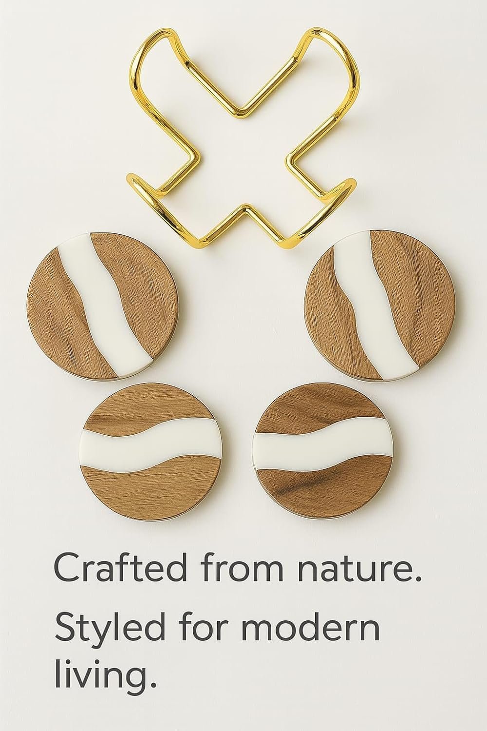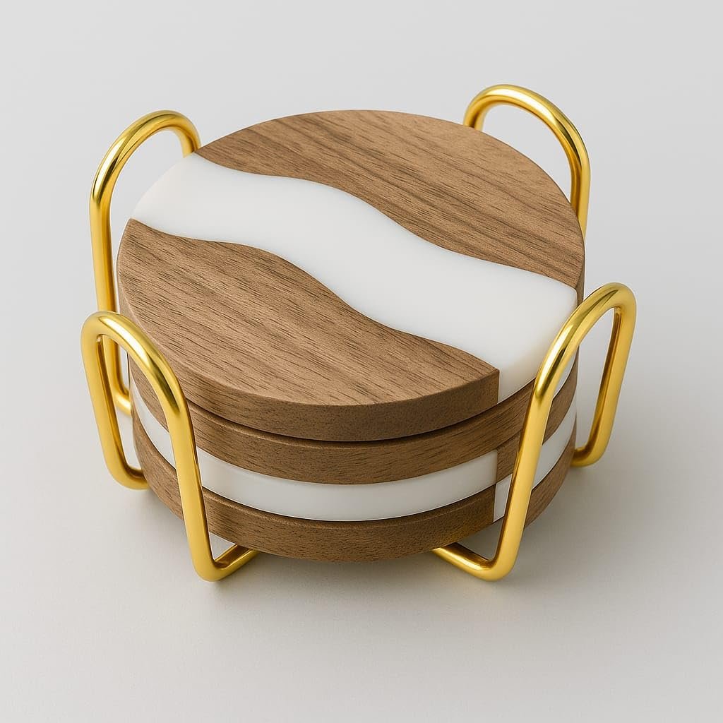 Protect your surfaces in style with this beautifully crafted wood and resin coasters set. Each round coaster features a unique blend of warm natural wood and sleek white resin, creating an eye-catching accent for any dining table, coffee table, or office desk. Designed for everyday use, these dining table coasters are durable, heat-resistant, and easy to clean — keeping your furniture safe from water rings, heat marks, and scratches. For added convenience and style, this set comes with a sturdy gold metal stand, keeping your coasters neatly stacked and ready to use at any time. Perfect for family gatherings, festive dinners, or simply enjoying your morning coffee, this coasters set also makes a thoughtful housewarming or holiday gift for friends and loved ones. Bring home this blend of natural charm and modern design — your tables will thank you!