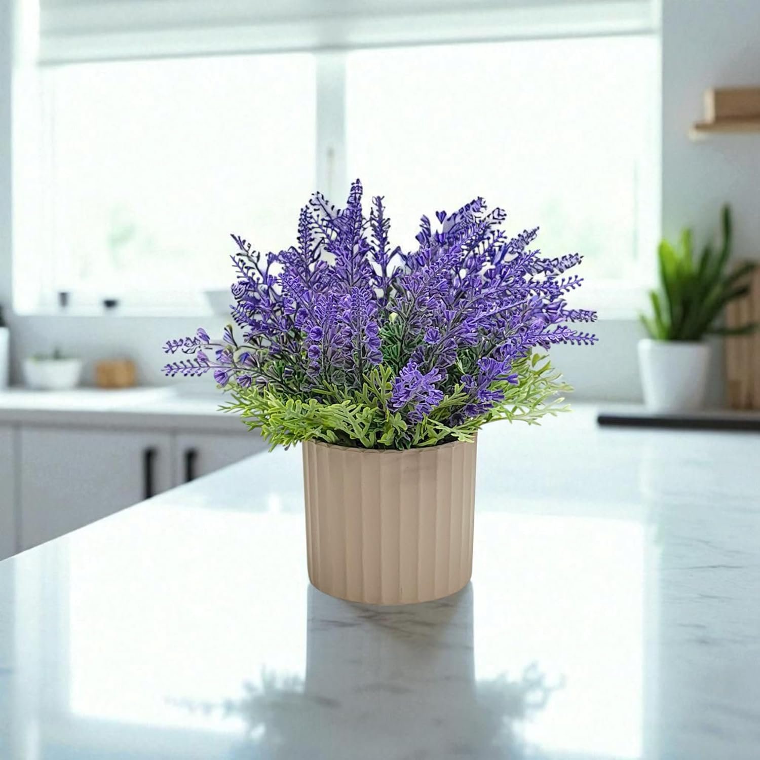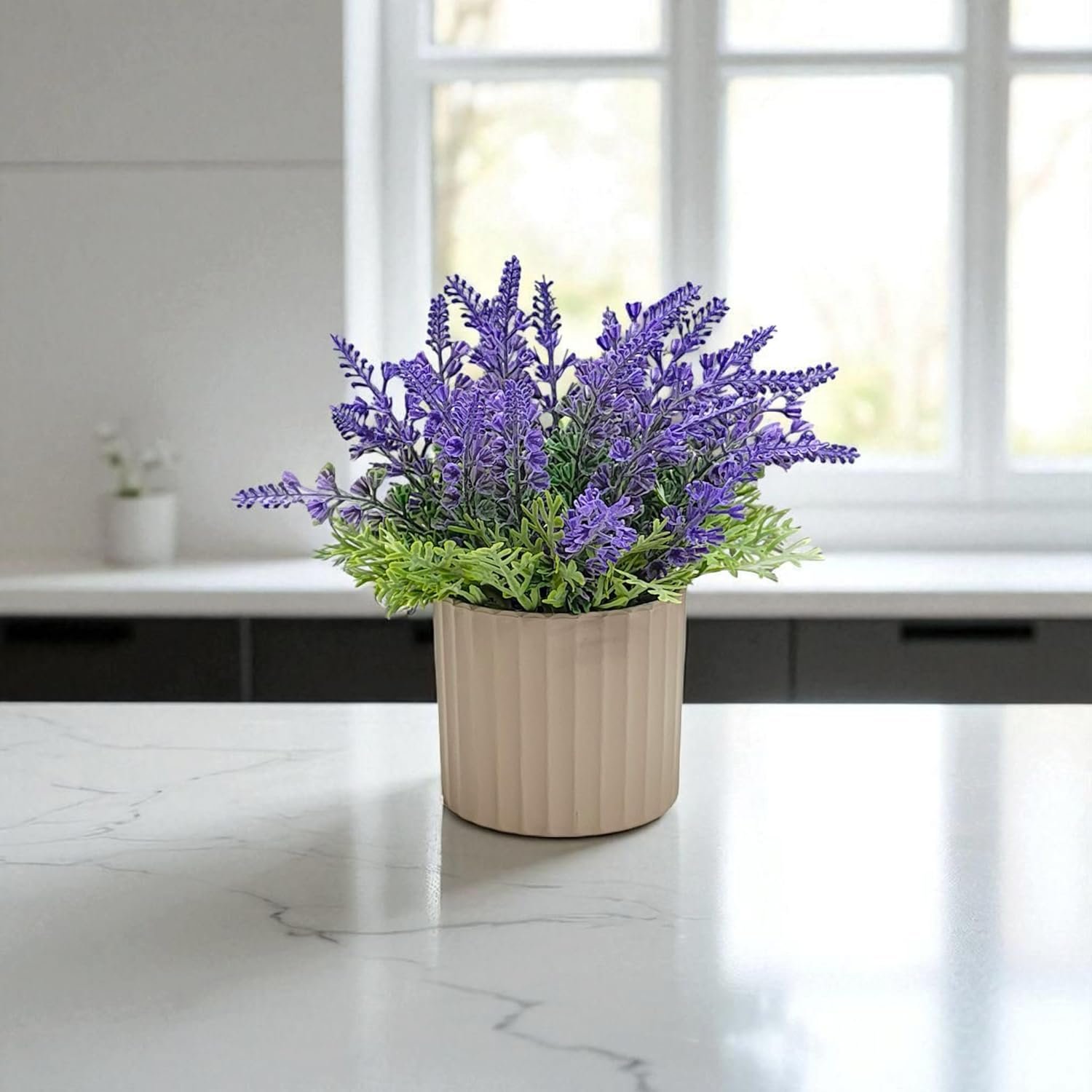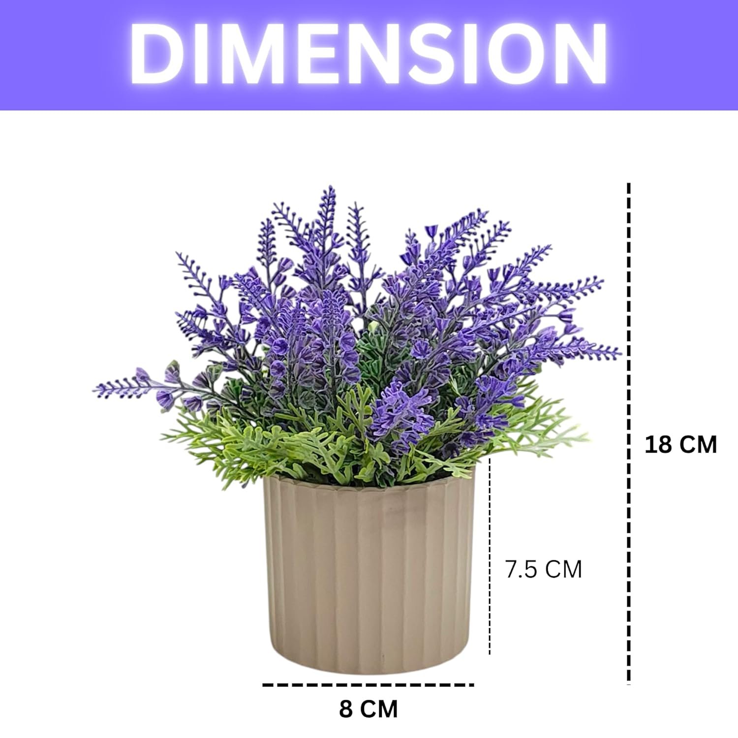 DECORATIVE POT: Comes in a stylish contemporary planter that complements the artificial lavender and suits various interior design styles