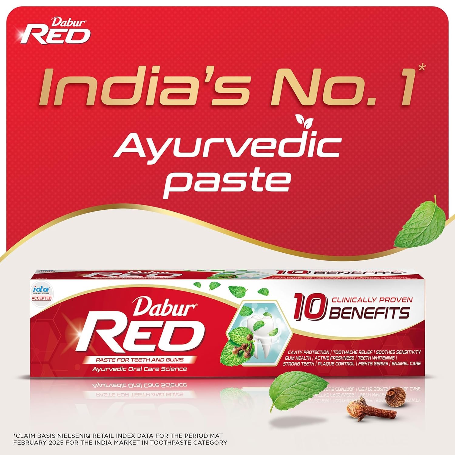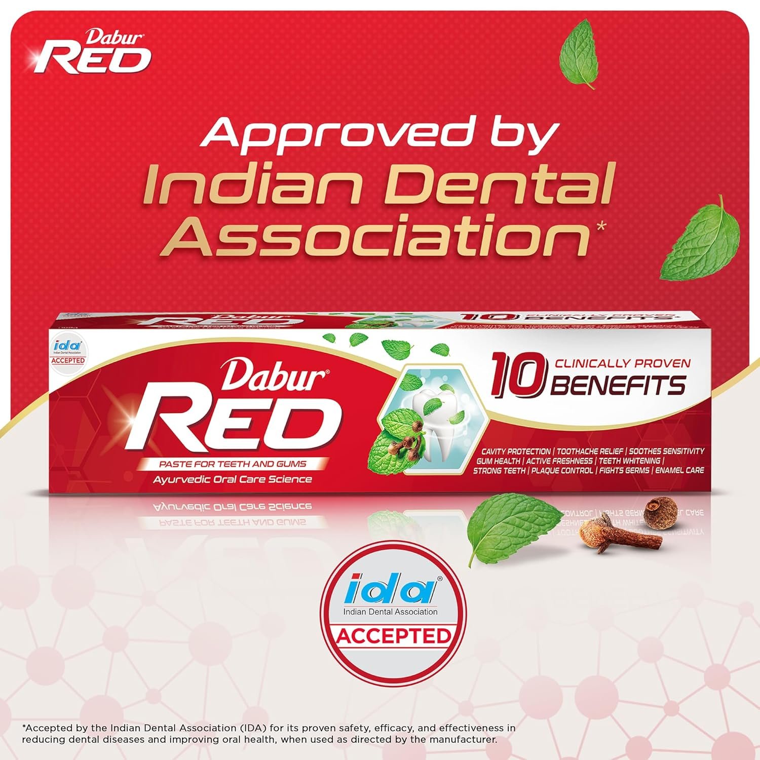 DABUR RED PASTE has a clinically proven formula that fights against 7 DENTAL PROBLEMS 1) TOOTHACHE, 2)CAVITIES, 3) plaque, 4) germs, 5) bad breath, 6) yellowing, and 7) bleeding gums