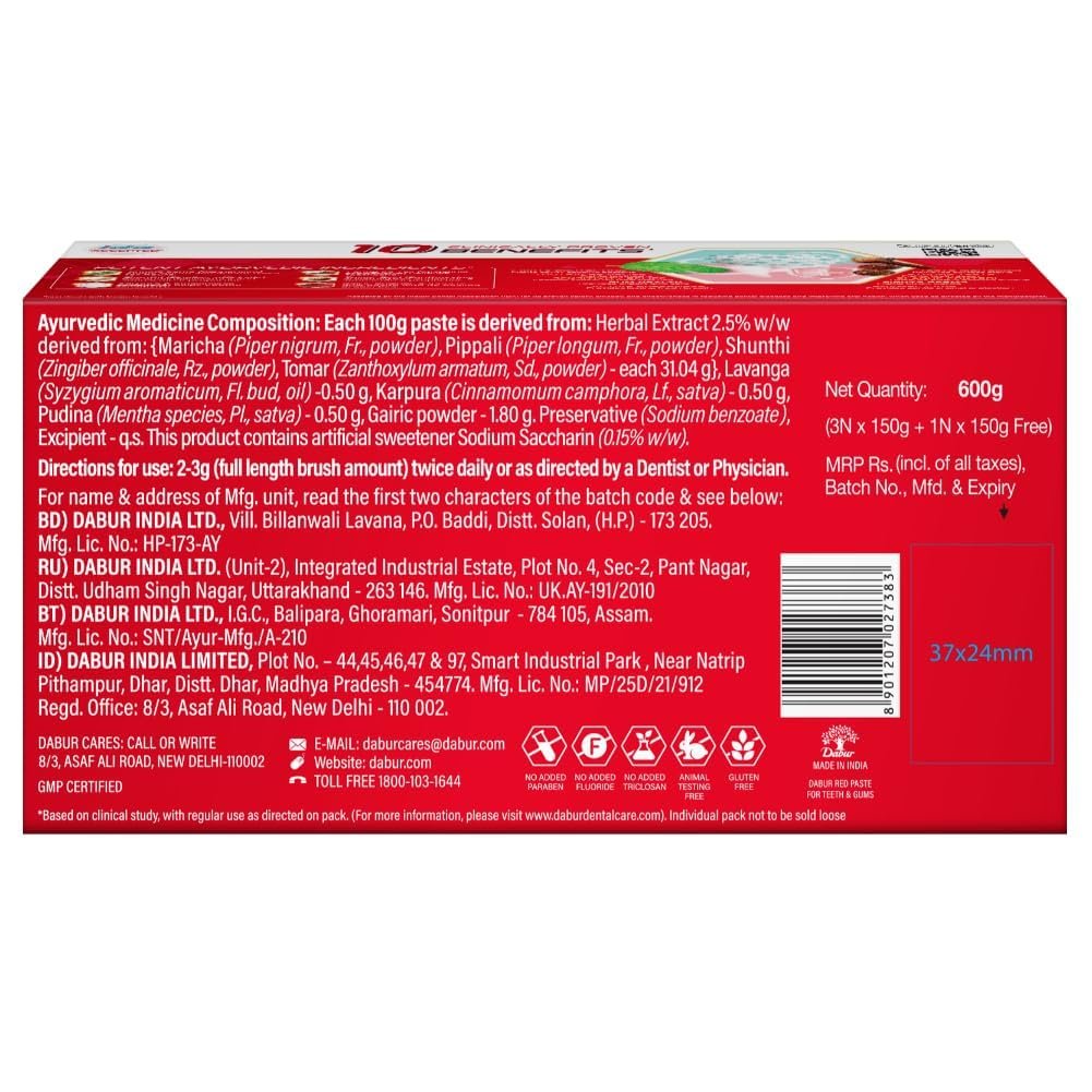 Dabur Red Toothpaste – 600g (150g x 4) | Ayurvedic Paste | Provides Germ Protection, Cavity Protection, Plaque Removal | Prevents Gum Bleeding, Yellow Teeth, Toothache, Bad Breath