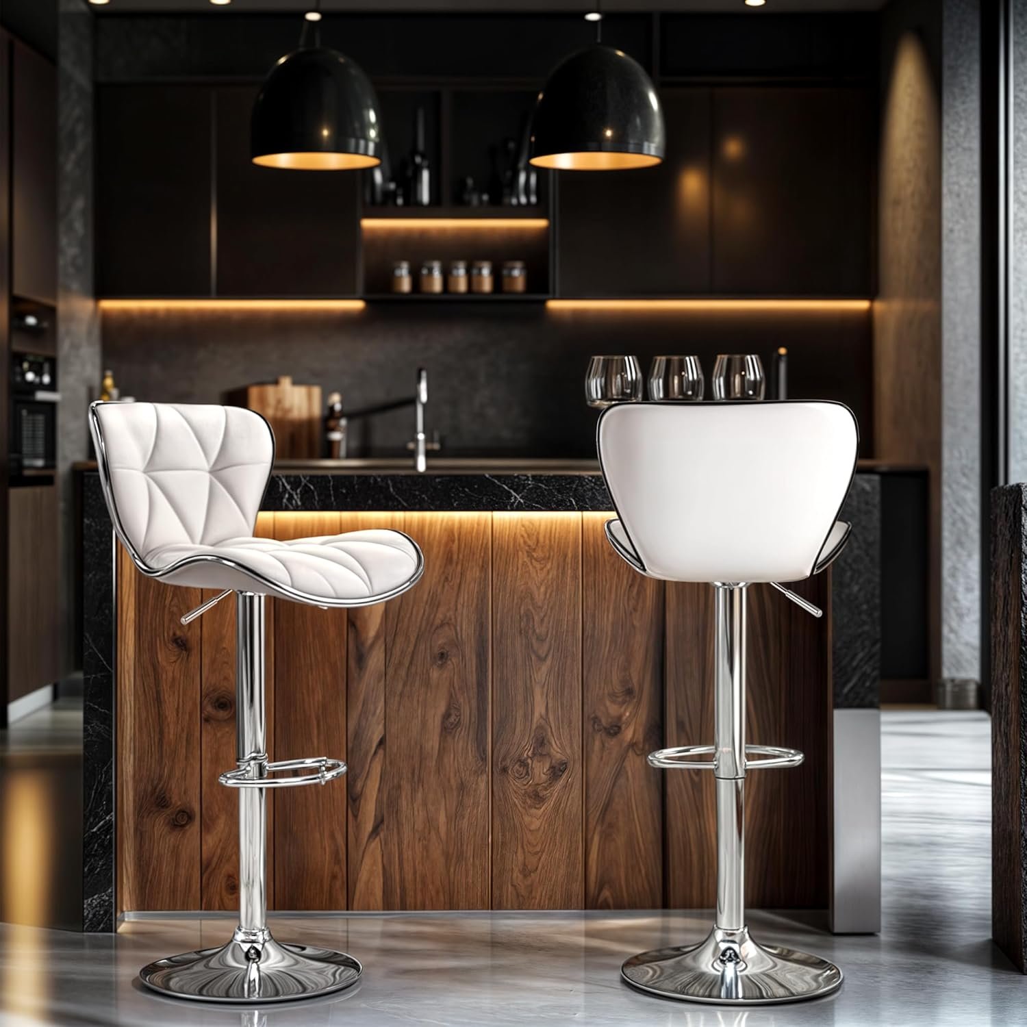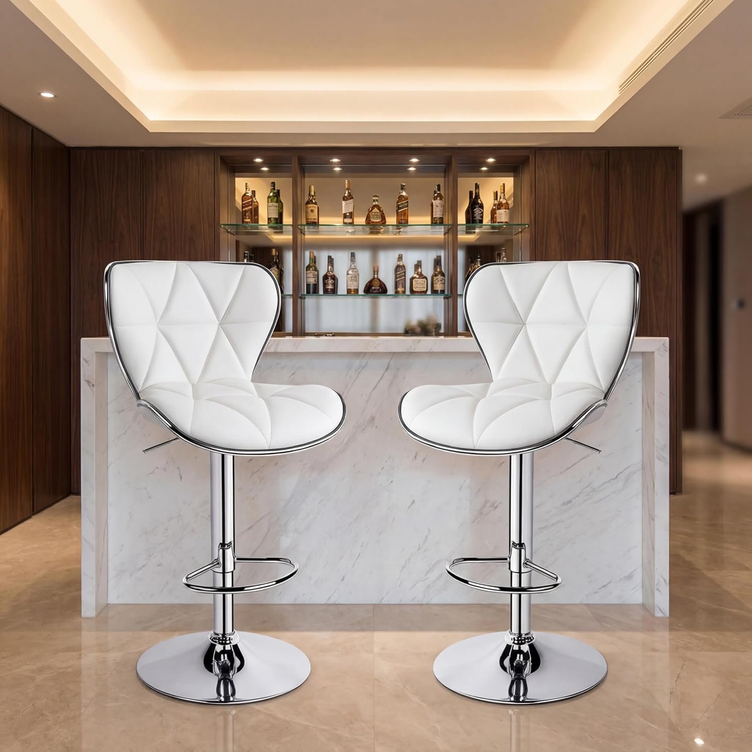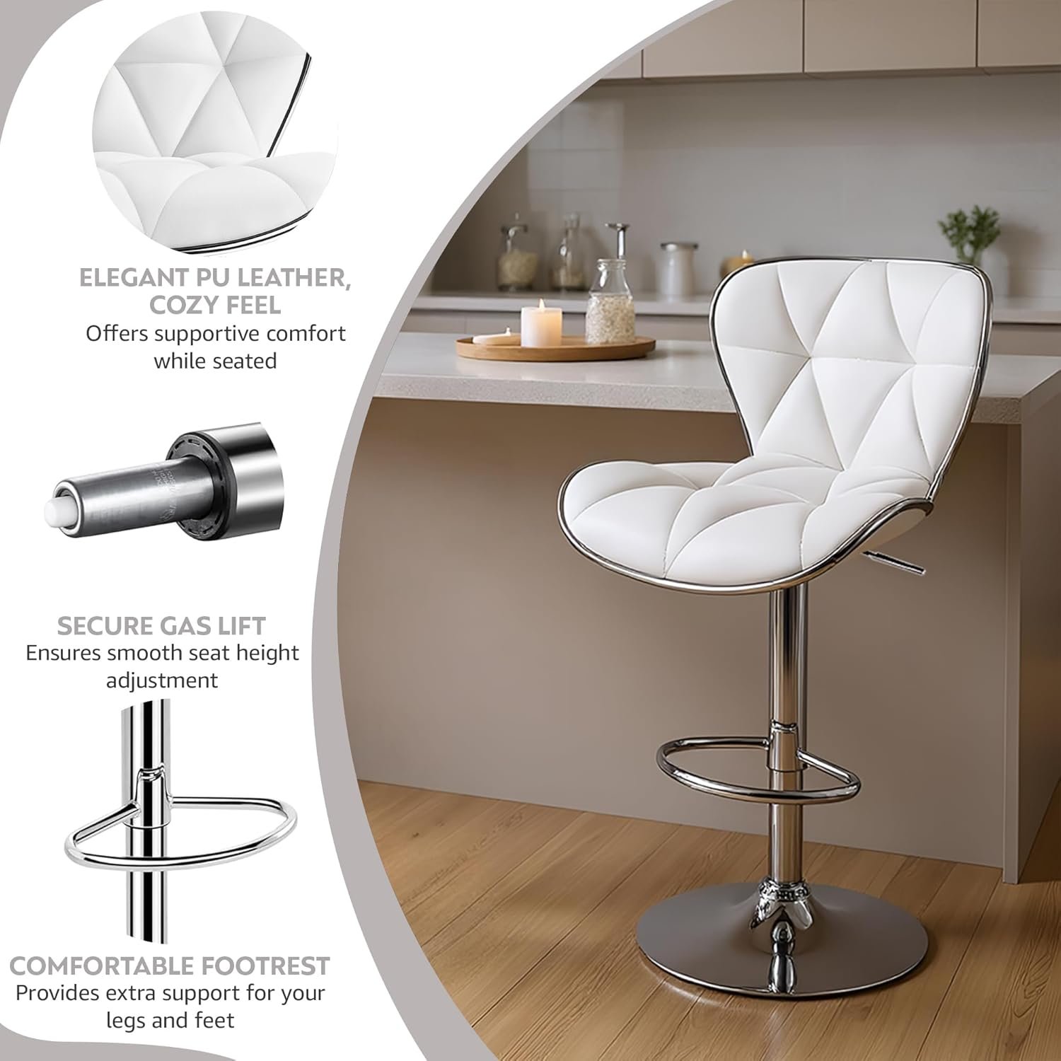 🥂 HIGH-QUALITY MATERIAL: Upgrade smooth PU leather feels skin-friendly and cozy, further improves the wear resistance, waterproof, and easy to clean. 3 cm thick cold foam sponge filling, will not be as loose as other bar stool, providing strong support for the human body. The double-line sewing ensures the edge of the cushion will not crack. You will long-term using these bar stool chair.