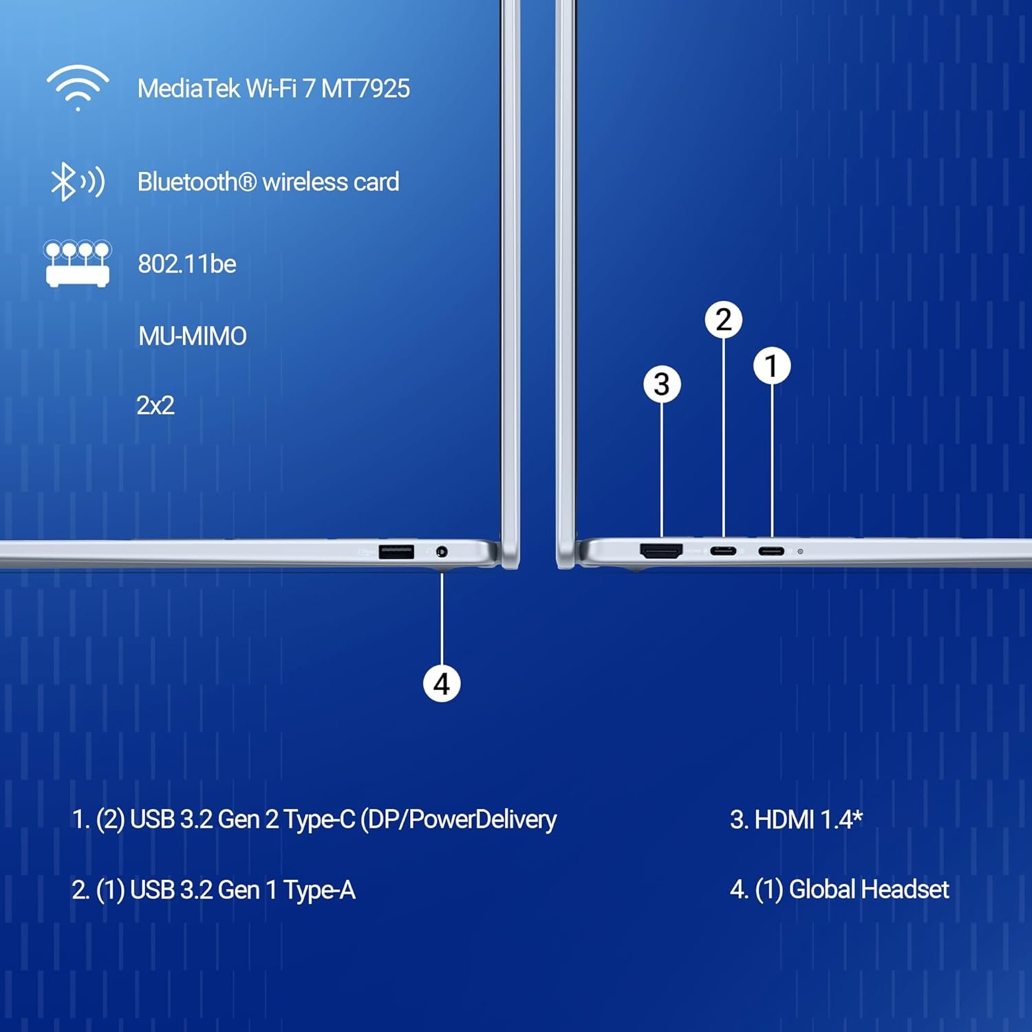 Ports: HDMI 1.4*, (2) USB 3.2 Gen 2 Type-C (DP/PowerDelivery, (1) USB 3.2 Gen 1 Type-A, (1) Global Headset