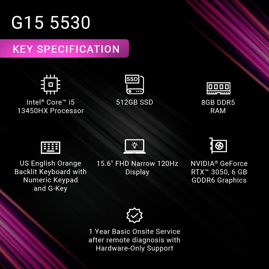 i5-13450HX | 8GB DDR5 | 512GB SSD | Win 11 + Office H&S 2021 | NVIDIA® GeForce RTX™ 3050, 6 GB GDDR6 | 15.6″ FHD Narrow 120Hz | US English Orange Backlit Keyboard with Numeric Keypad and G-Key | 1 Year Basic Onsite Service after remote diagnosis with Hardware-Only Support | Dark Shadow Gray with Black thermal shelf