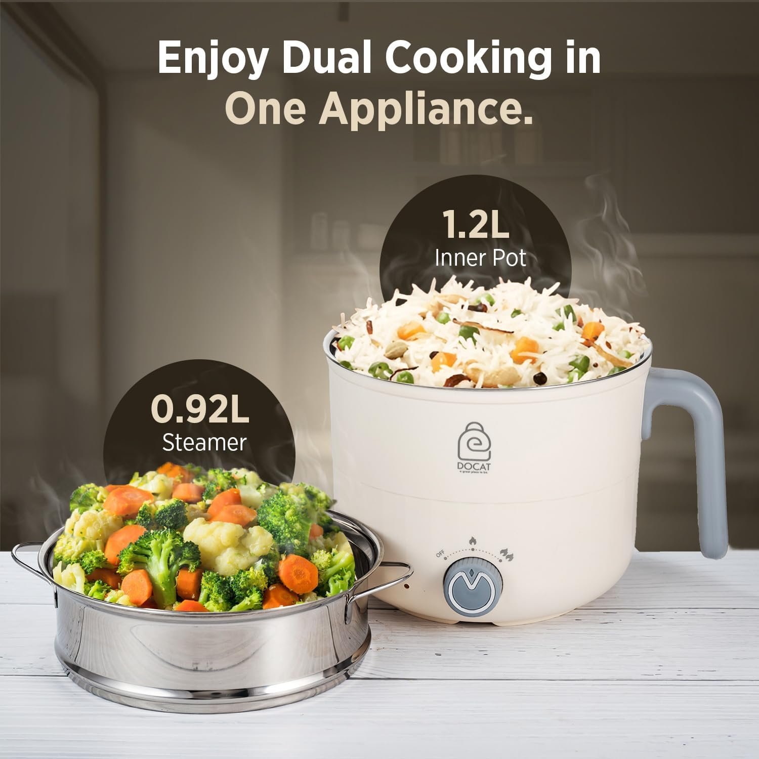 DOCAT Multi Cook Electric Kettle with Steamer 1.2 Liters Stainless Steel Non-stick Inner Pot, Adjustable Power Mode, Wide Mouth, Ideal for Boiling Milk, Tea, Coffee, Eggs (600 Watts)