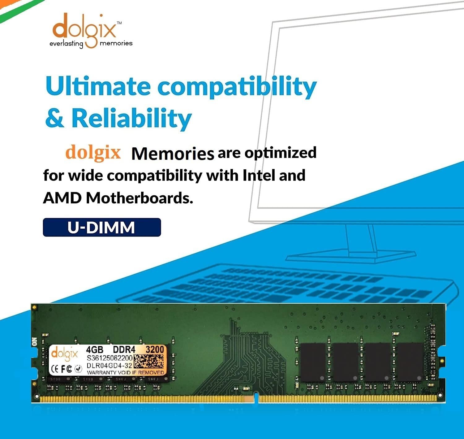 Dolgix 4GB DDR4 3200MHz RAM | Desktop RAM |CL-22 |Desktop-Memory| U-DIMM | Long-DIMM | PC4-25600 |1Rx8 Single Rank | 3-Year Warranty (Made in India)
