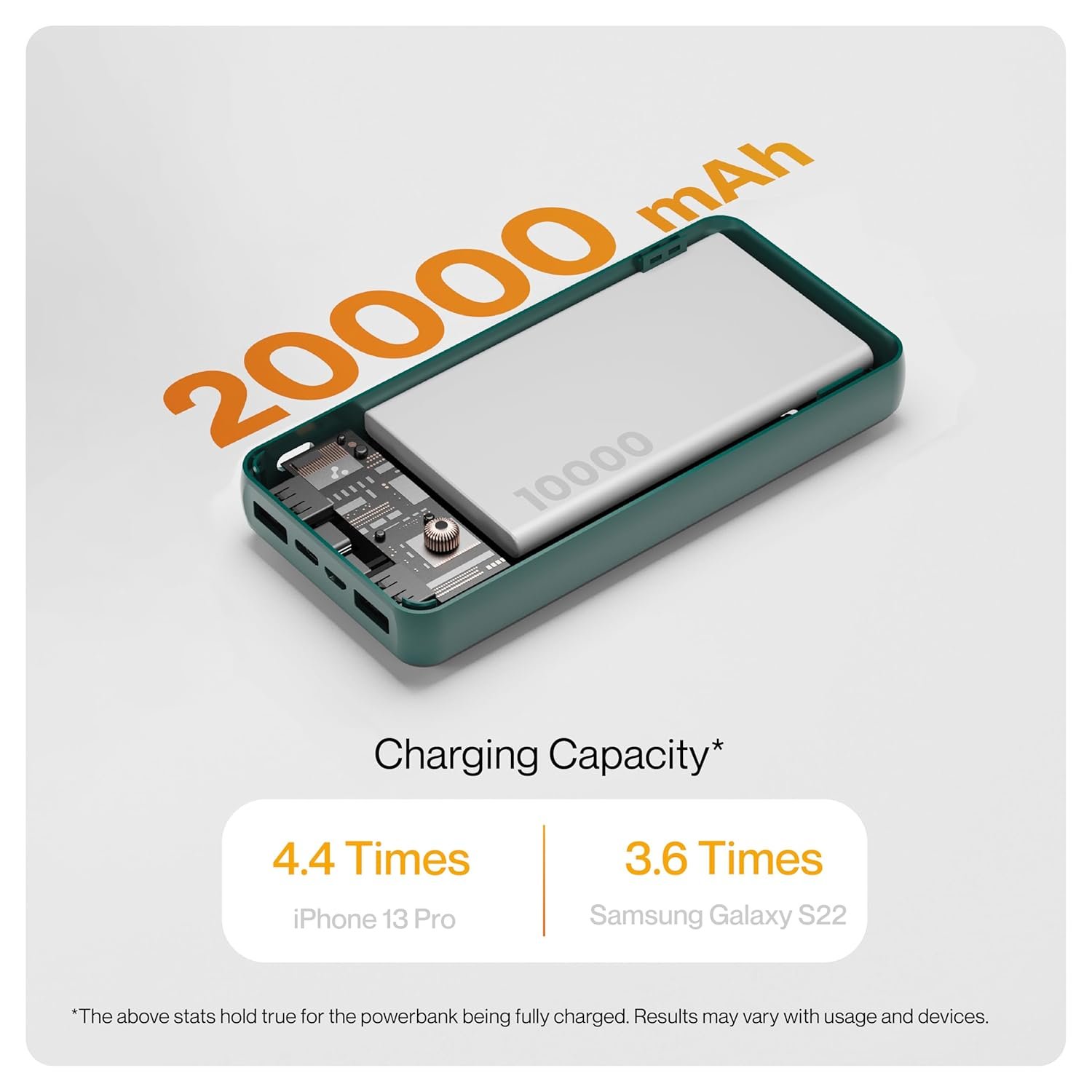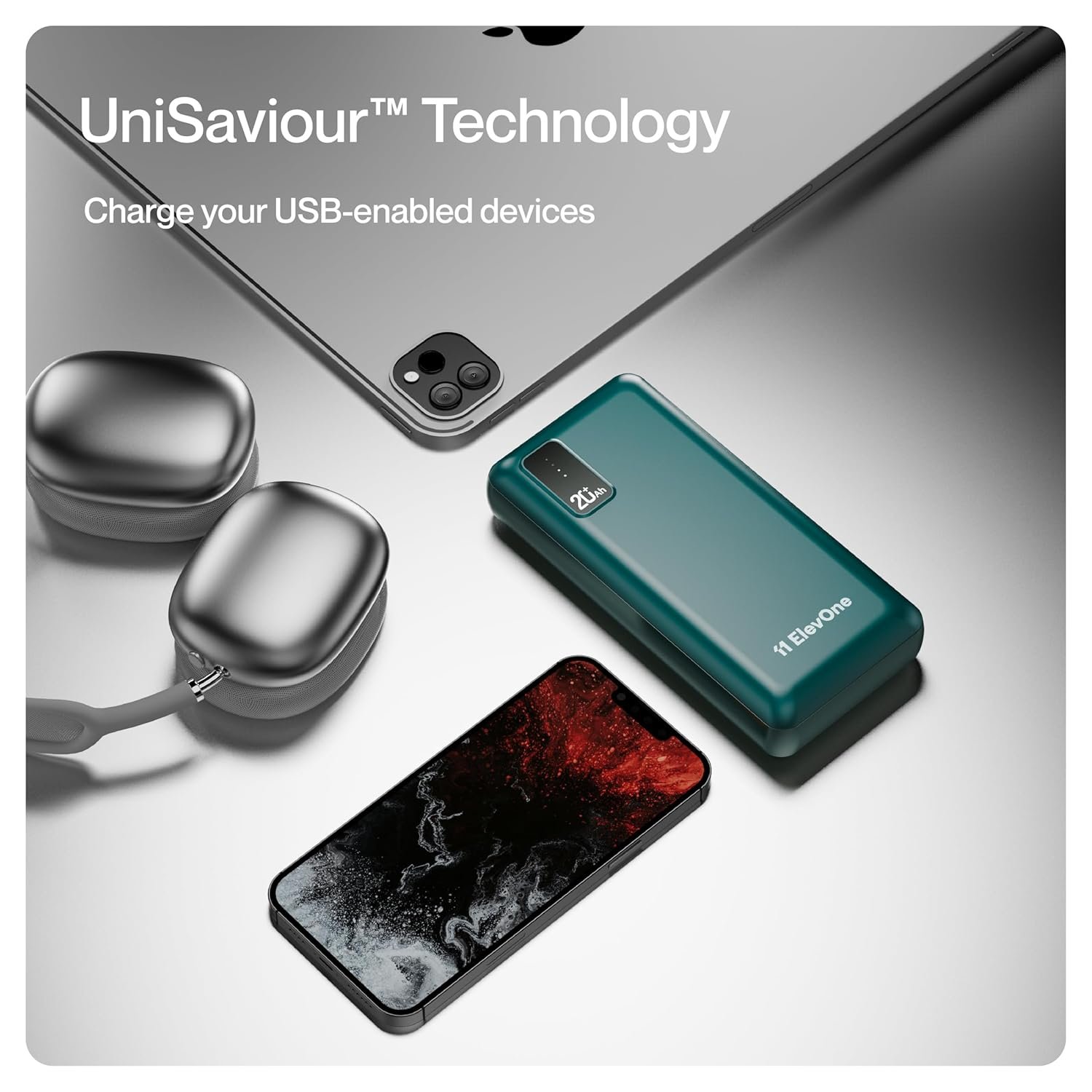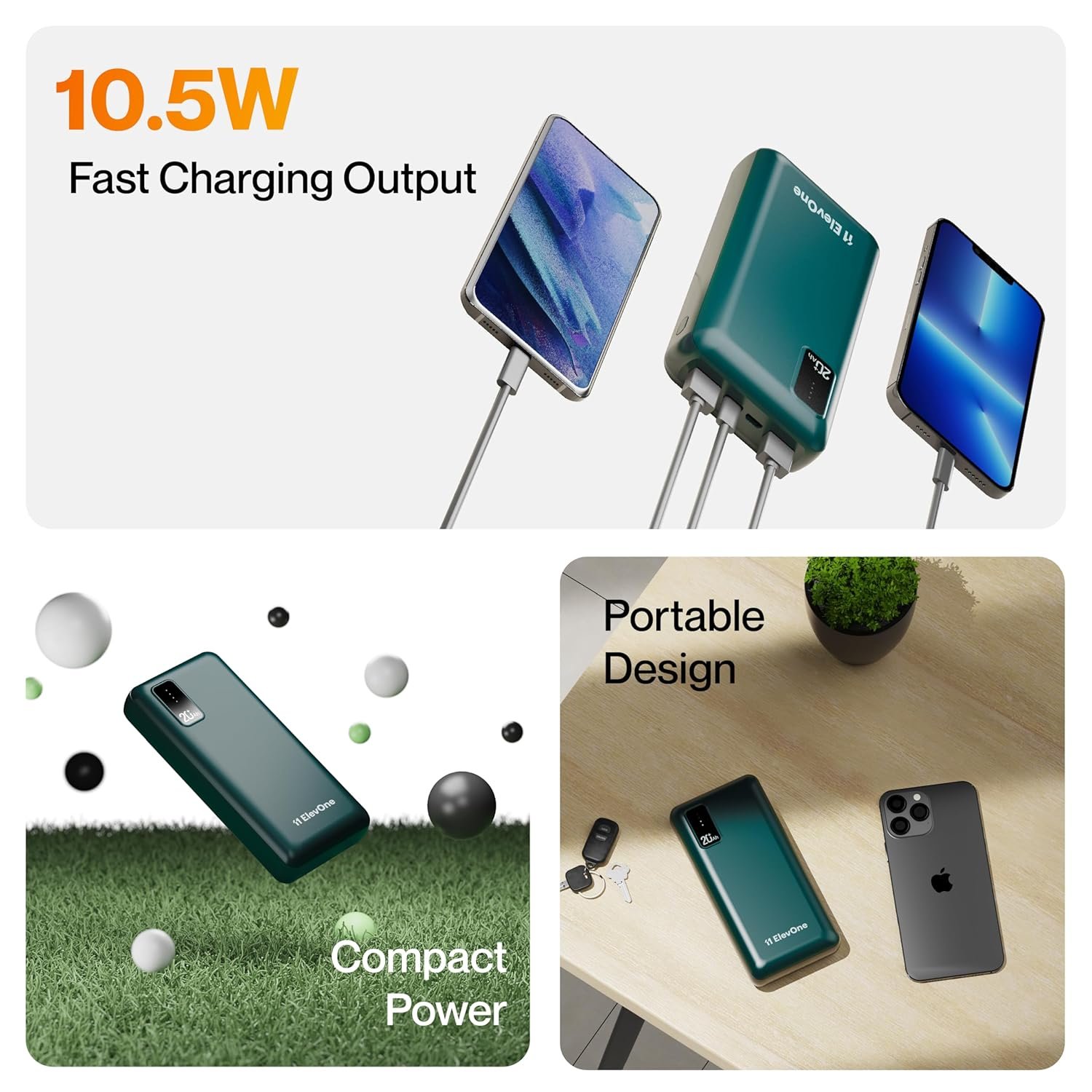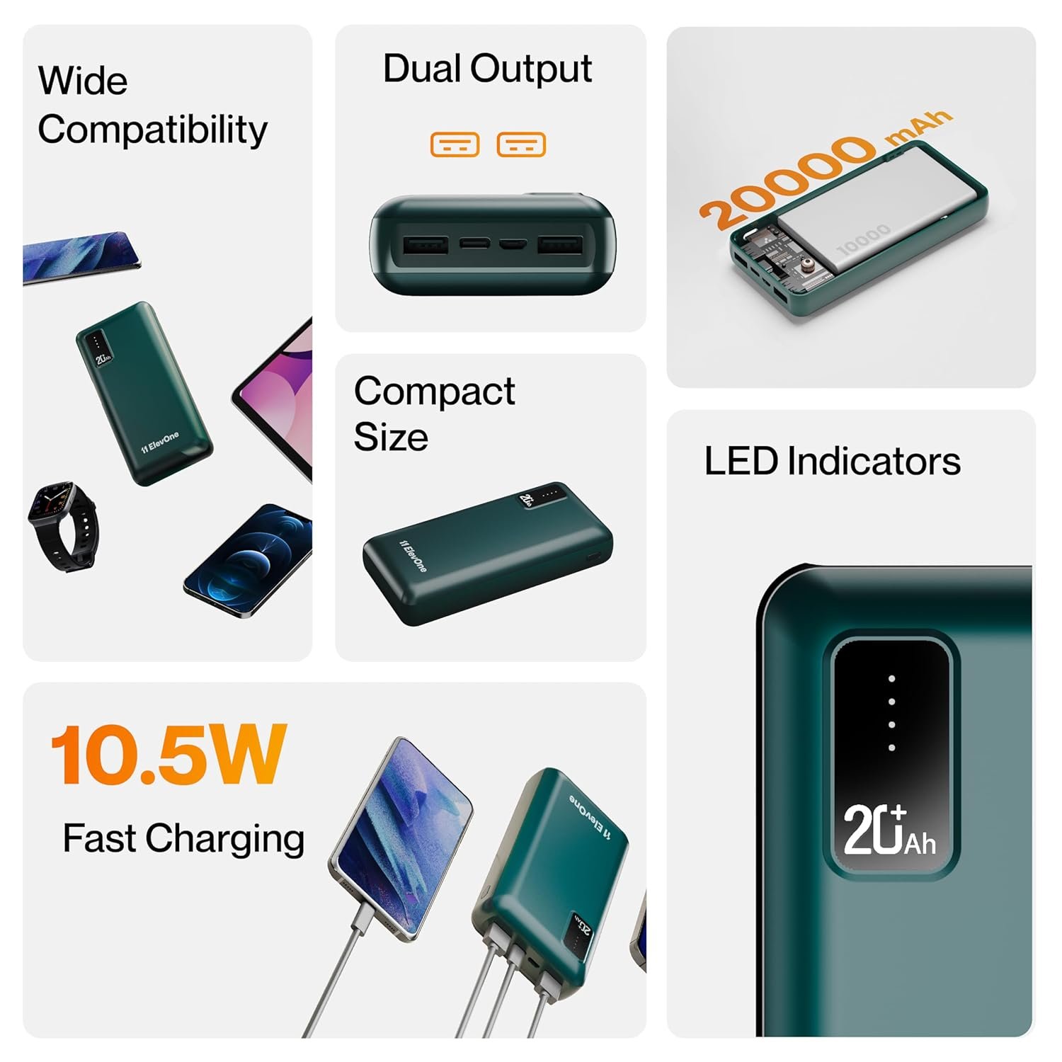 ElevOne by Ambrane 20000mAh Power Bank with 10.5W Fast Charging, Dual USB Output, Made in India, Multi-Layer Protection, Wide Compatibility, Stylish & Compact Design + Type-C Cable (Rapid 20, Green)