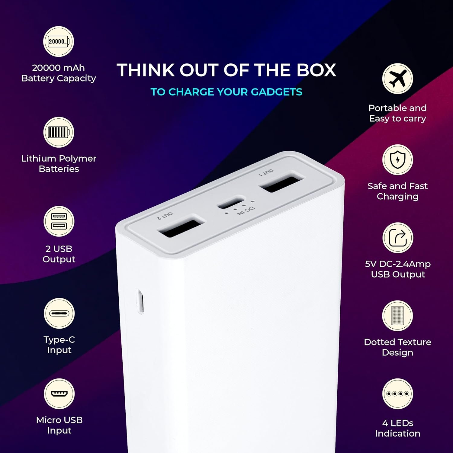 ERD PB-20KE Li-Polymer, 2 USB Output, 12W Power Bank, 20000mAh Type-C Micro USB Input Ports, Compatible with Smartphones, Laptop, Smartwatches, Neckbands, Speakers & Other Devices, White