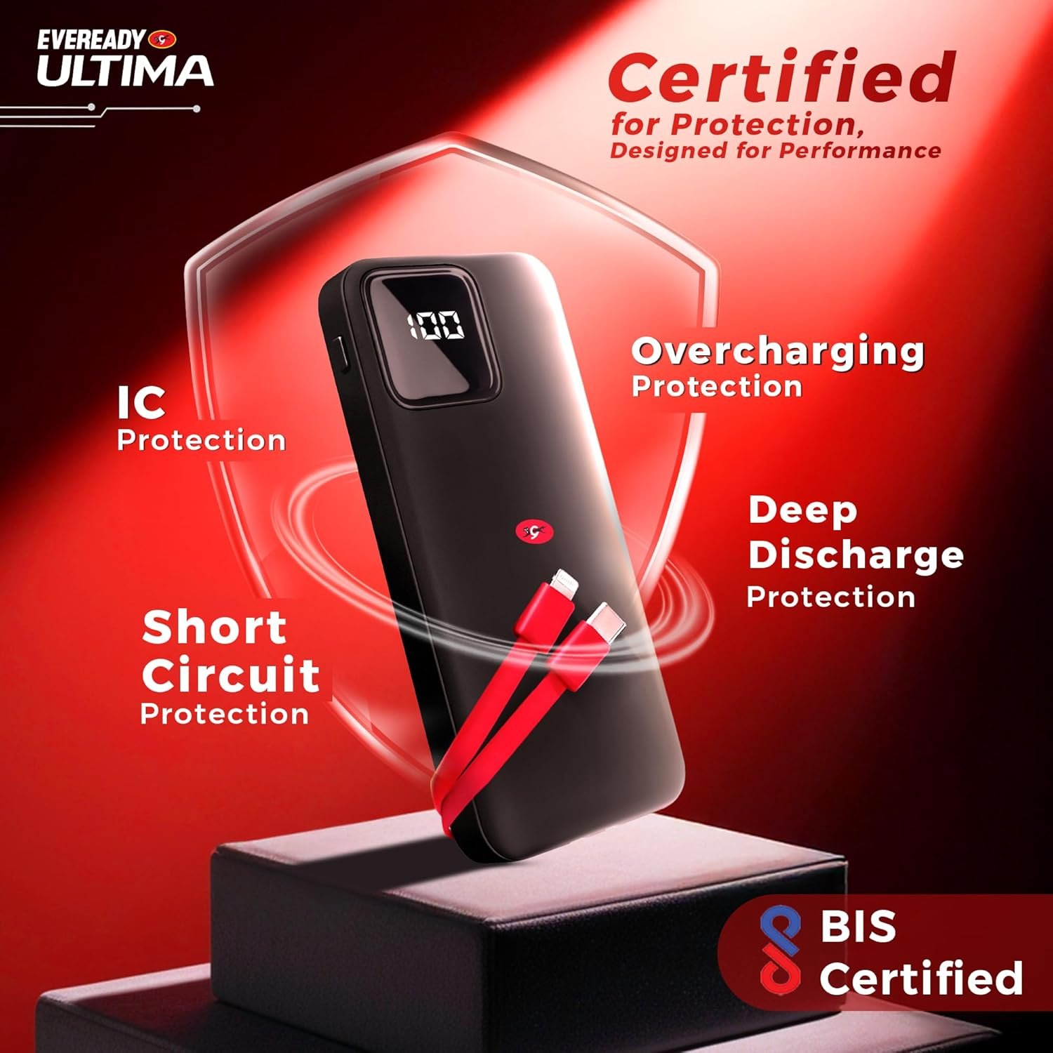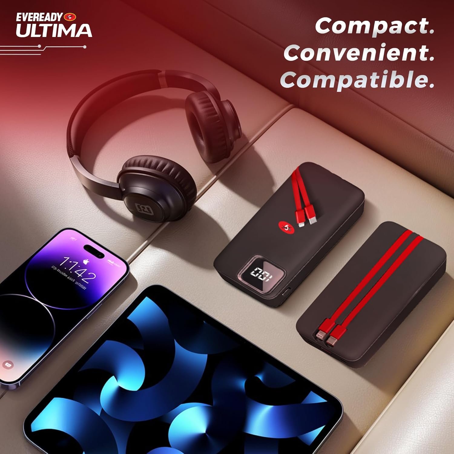 Really impressed with the Eveready Ultima PB10. The built-in cables are super handy—no more forgetting to pack extras. Charges my phone fast with the 22.5W output, and the digital battery display is a nice touch. It’s compact, feels solid, and works well with all my devices. Great value for a 10,000 mAh power bank with multiple safety features!