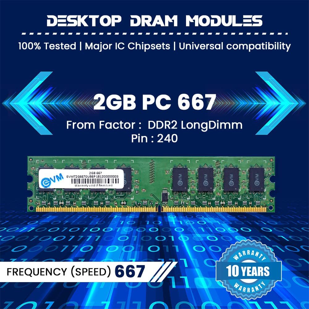 EVM 2GB DDR2 Desktop RAM 667MHz Long-DIMM Memory – Boost Your Computer’s Performance with Reliable and Efficient Memory Upgrade – 10 Year Warranty (EVMT2G6670U86P)