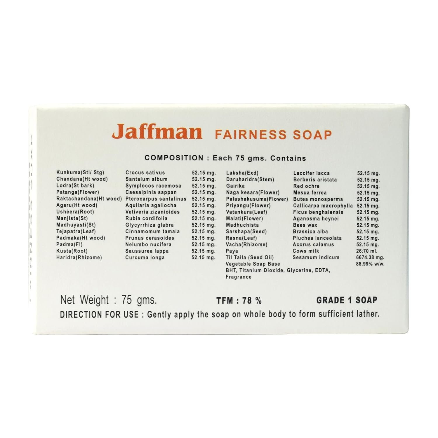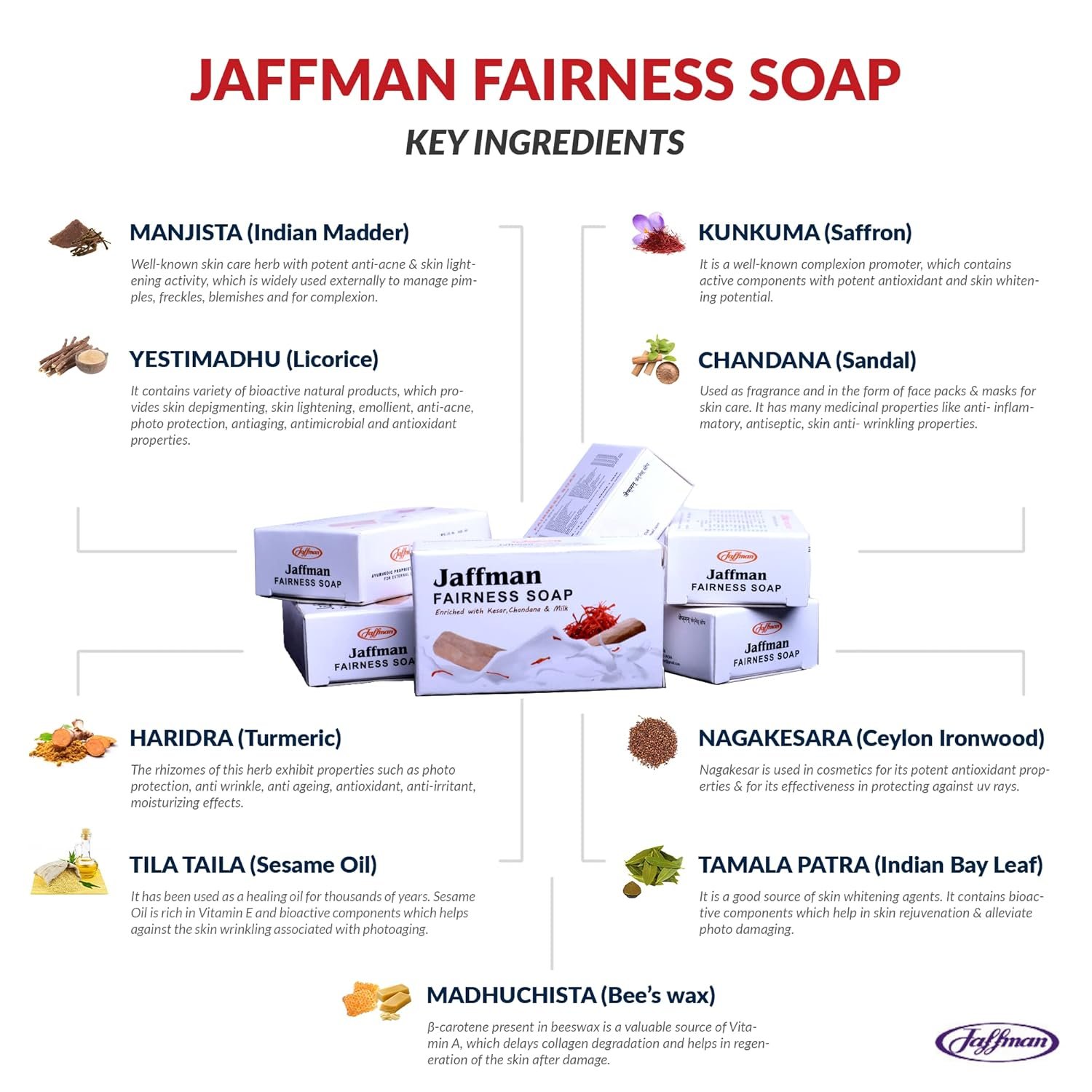 Jaffman Fairness Soap is a Natural way To brighten, Lighten & Whiten the skin complexion. Jaffman Fairness Soap is made from herbs such as Kunkuma (Saffron), Chandana (Sandal) Raktachandana, Haridra (Turmeric), Manjista, Yestimadhu (Licorice) etc. These ingredients are time tested and used to deliver skin lightening effects. The active principles of the herbs are extracted in Tila taila (Sesamum oil prepared in wooden ghani machine which is chemical free and pure) and milk, which enhances the properties of the medicaments. These ingredients collectively help to treat melasma, hyperpigmentation & acne scars. These herbs are packed with natural powerful antioxidants, skin lightening, anti-inflammatory activities and vital nutrients which may help to nourish the skin and improve complexion. Tila taila (Sesamum oil) & Milk helps to smoothen the skin and makes it soft and supple.