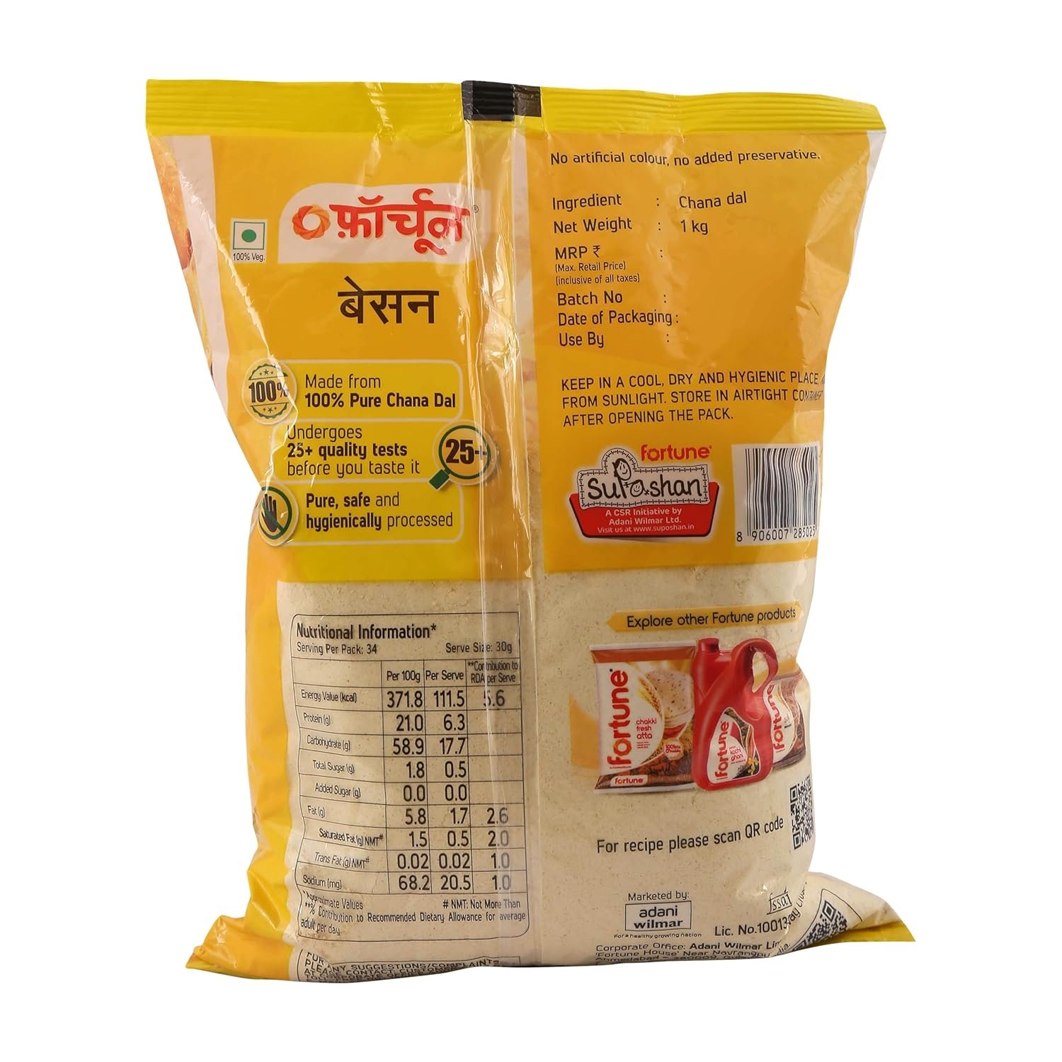 Fortune Besan is hygienic made from 100% chana dal and passes through more than 25 quality checks and processed with advanced grinding technology which retains the flavors and aroma of natural chana dal. Highest grade of chana dal and only standardized colored chana dal passes through our advanced color sortex machine for grinding to give consistency in Fortune Besan leading to the finest taste of any recipe.